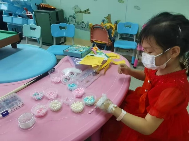 思雨边串手链边聊输血的事情,我问她输血疼吗?她说:“不疼,而且也没有觉得不舒服。说爸爸今天去给我输血了,他每次输血回来,我都会抱抱他……”写到这里,我的心里和昨天一样,依然有着说不出来的感受,鼻子酸酸的。为什么生病的孩子都是那么乖巧懂事?!另外,她给我说,她要吃一种药,吃完那个药就要把头发剃光,看着她乌黑长长的头发,我问:你要剃头发害怕吗?她说:“我不怕!”天真可爱的孩子还没有意识到接下来的治疗是什么样子的。——志愿者CJ