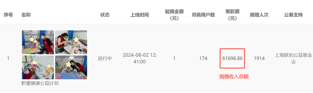 项目于2024年8月在上海联劝公益平台开启上线筹款至今,该项目共筹集善款 61698.86元。