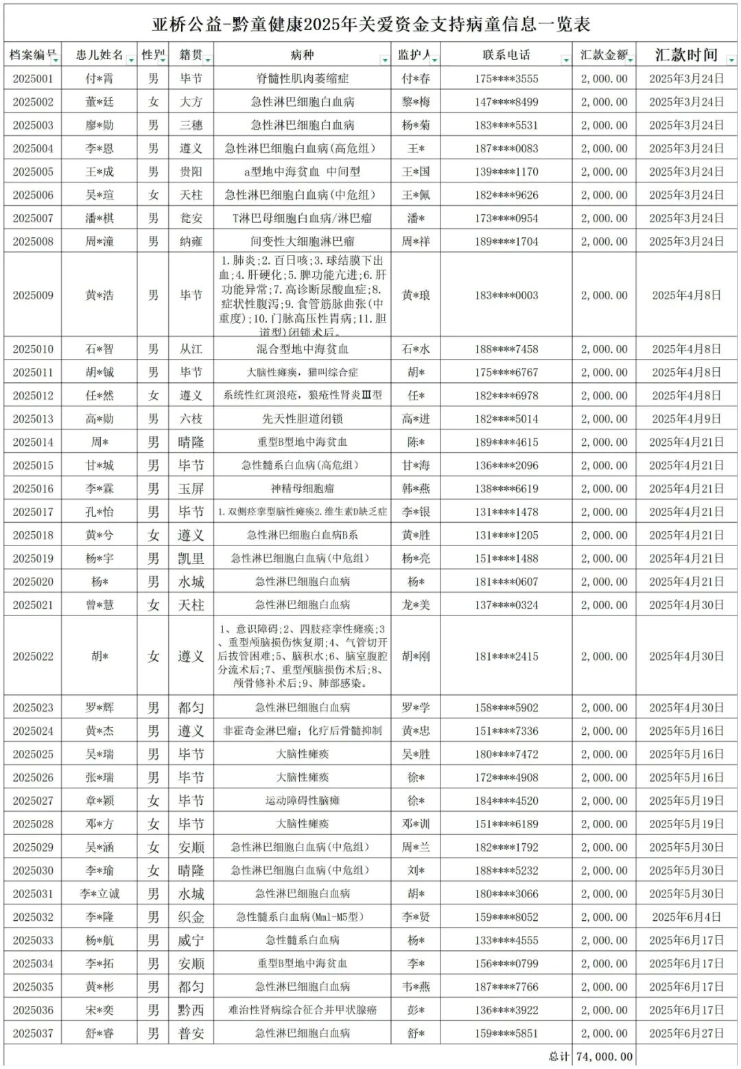 “黔童健康计划”作为亚桥公益持续推进的助医项目,始终致力于为贵州省重大疾病患儿及其家庭提供支持,涵盖志愿者探访、心理咨询、政策咨询及关爱资金等多项服务。