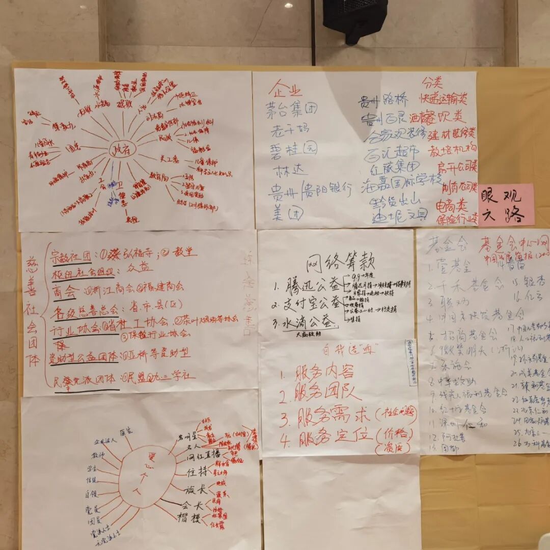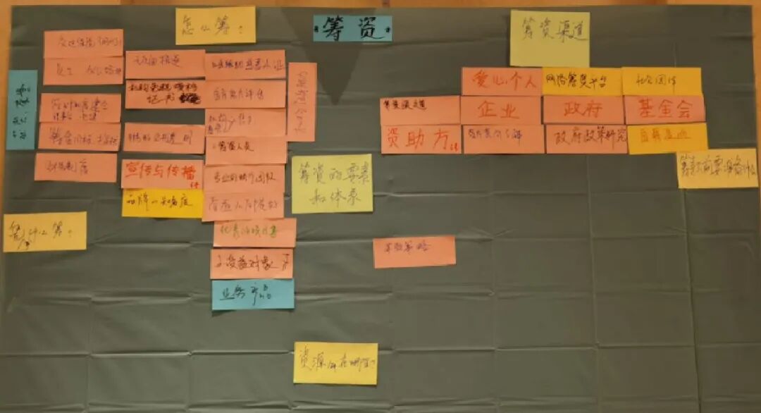 在明确可挖掘的筹款渠道后,伙伴们分成六路——从政府、企业、爱心团体、爱心个人、网络平台、基金会等方面分析可以如何去做。