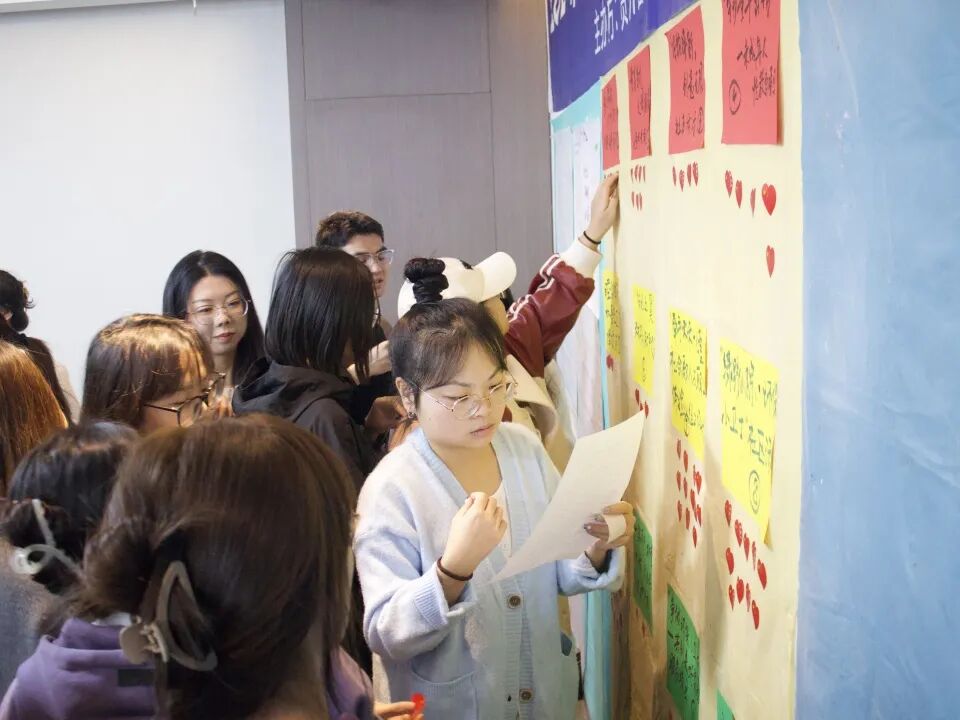 随后,通过“打分圈”让同学们对自己的实习体验进行自我评估。在这个过程中,大家还通过情绪词条分享了实习期间的快乐、悲伤、遗憾和意外。