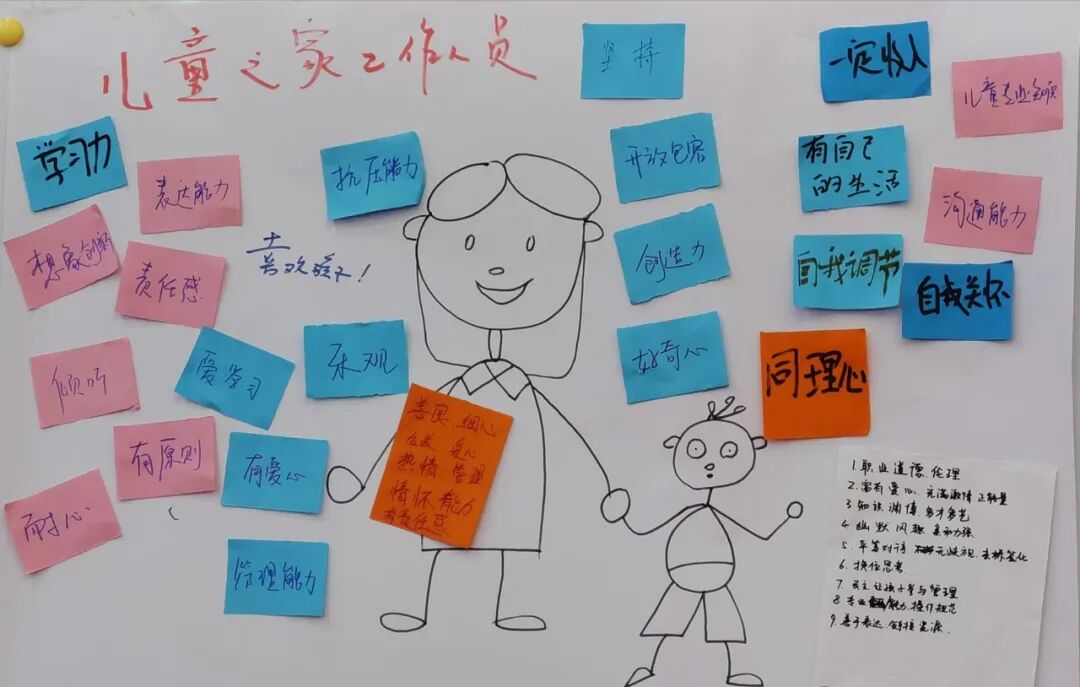 儿童友好空间建设最为核心的要素是什么?当然是我们服务于儿童的工作者们。在之后的讨论中,我们针对服务人员的能力培养,共同探讨了“儿童友好空间工作人员是什么样的”?老师们奇思妙想,共同塑造了一个完美的儿童服务者形象,也看到了自己的不足和挑战。