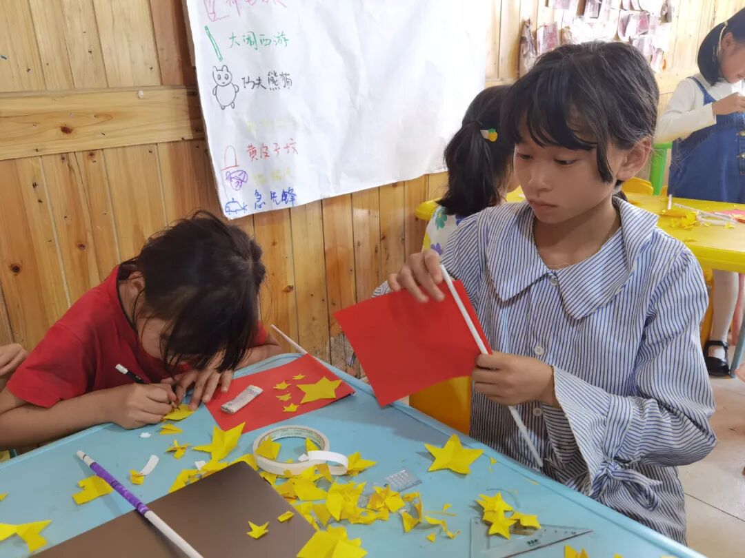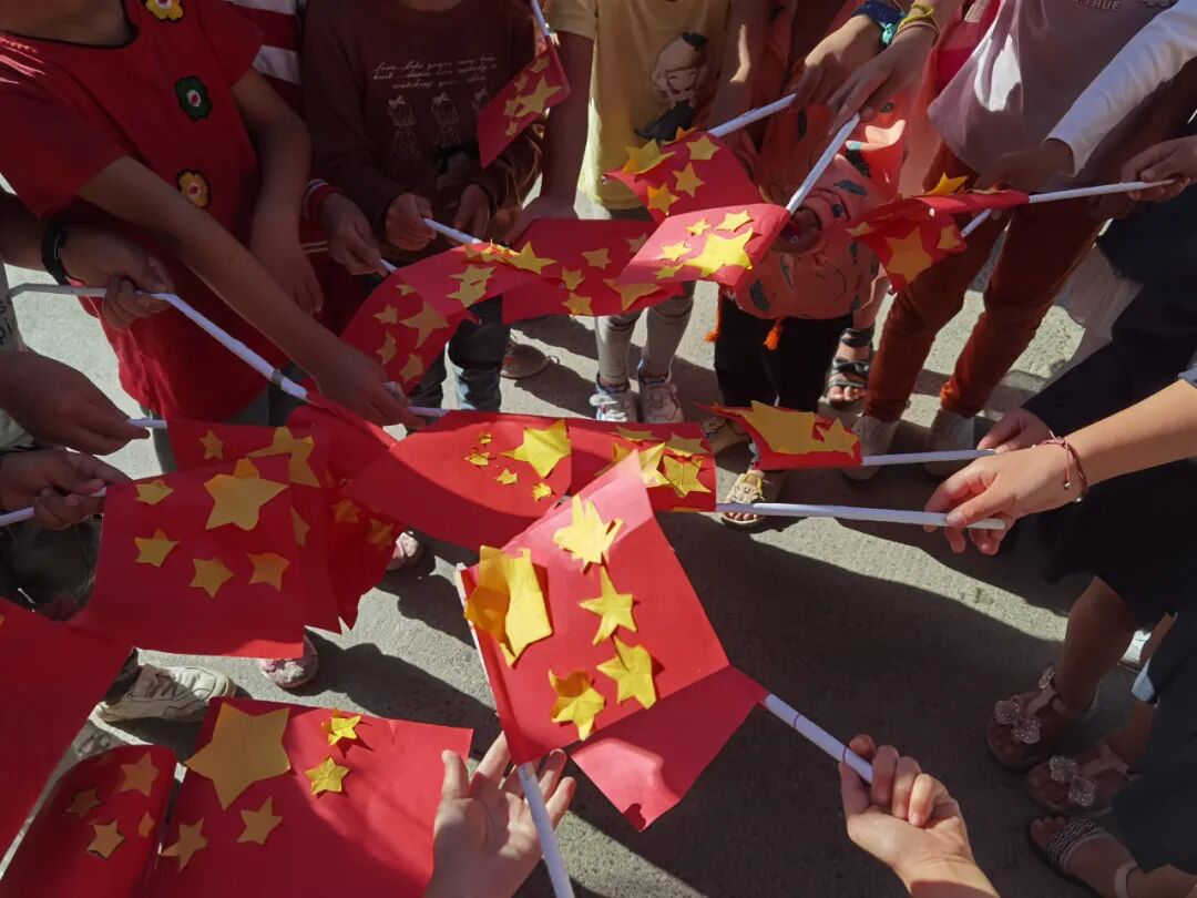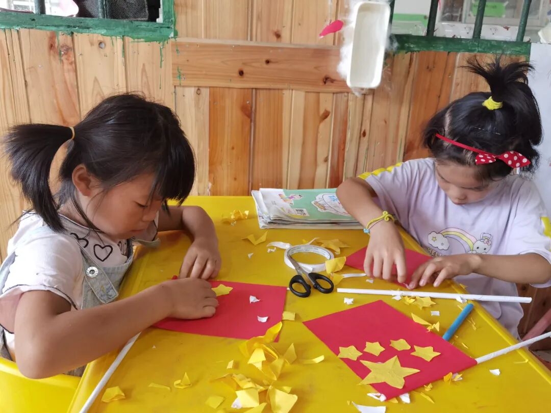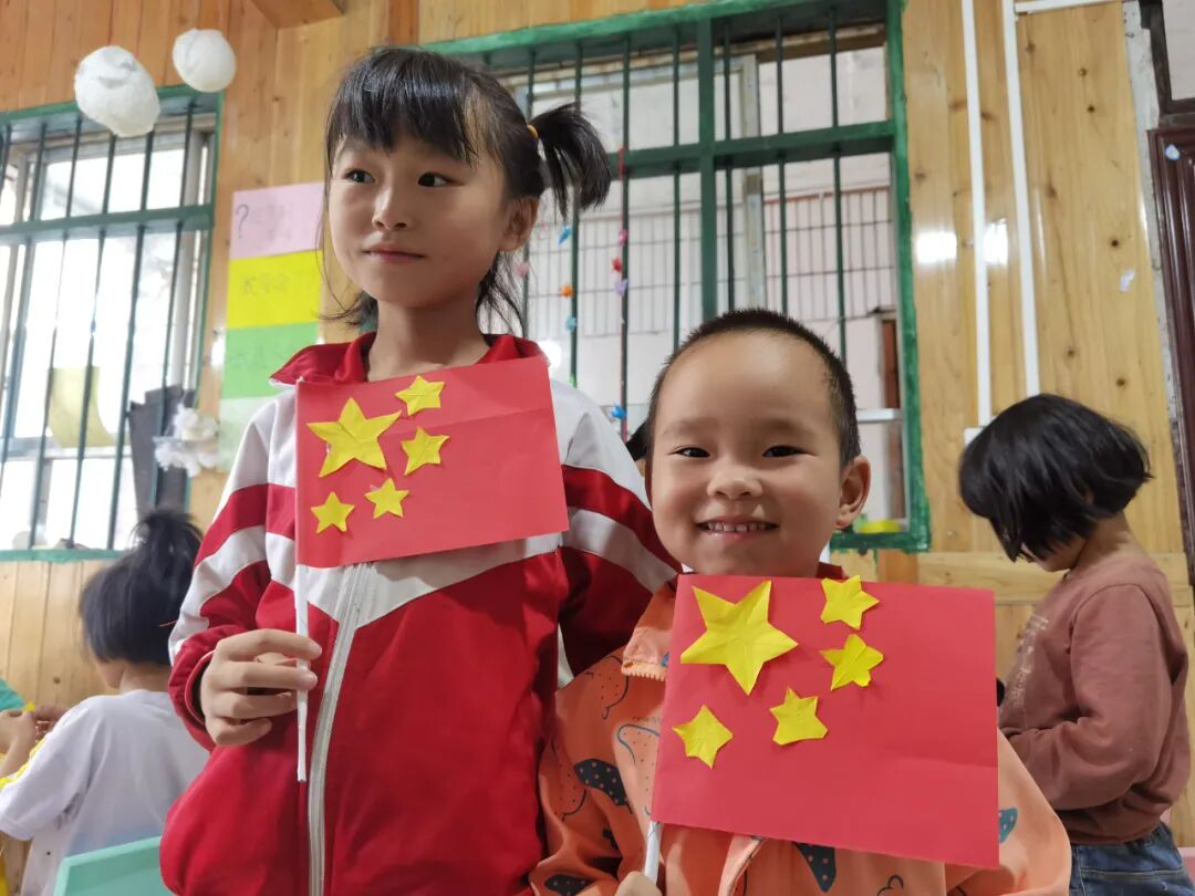 国庆佳节,转眼间就到来了。儿童之家的小朋友们也在用自己的方式进行庆祝—DIY五星红旗、合唱和手势舞《名字叫中国》。中华人民共和国国旗为五星红旗,旗面用红色象征革命,星用黄色象征红色大地上呈现光明。一星较大、四星较小,表达亿万人民心向伟大的中国共产党,如似众星拱北辰。旗杆套为白色,以与旗面的红色相区别。