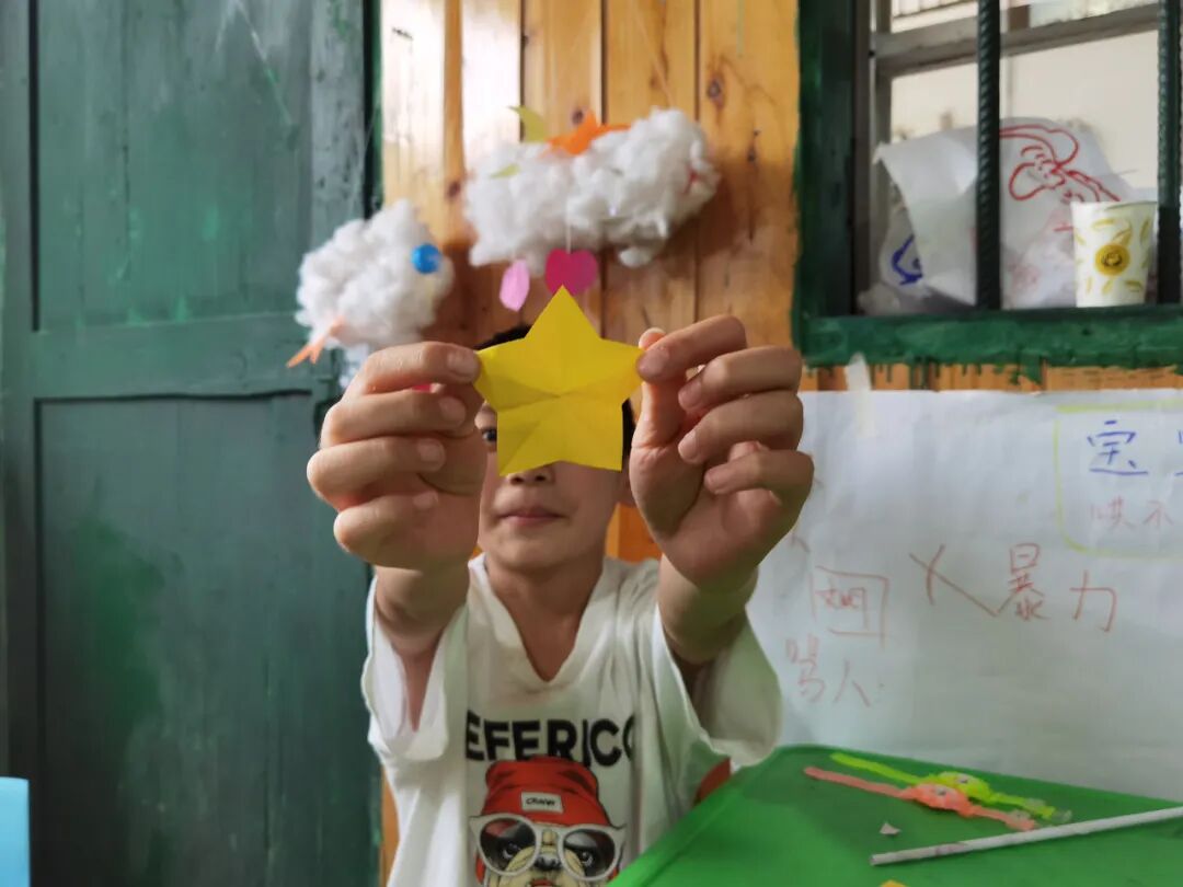 在制作国旗的过程中,想要剪出一个对称且完美的五角星是最困难的。有些同学经过几次的失败后选择了放弃,但还有很多同学遇到困难时,一边问老师、一边尝试该怎样剪,通过坚持不懈的努力最终把五角星剪出来了。放弃的同学看到后,也纷纷重新加入到其中。当所有的五星红旗出现时,每个小朋友的脸上都洋溢着自豪的微笑。有个国家她很伟大