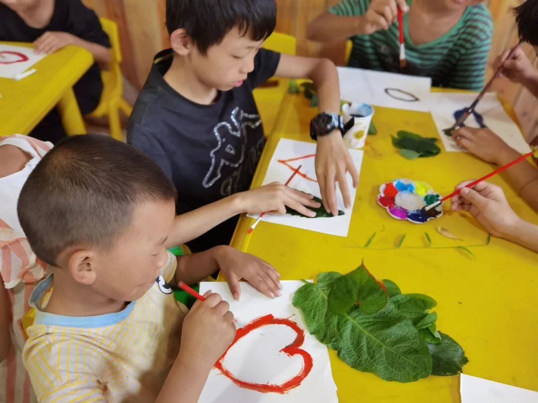 将颜料涂在树叶上,通过拓印到纸上的方式,可以让小朋友们看见树叶的形态和脉络,并对图案进行创作。