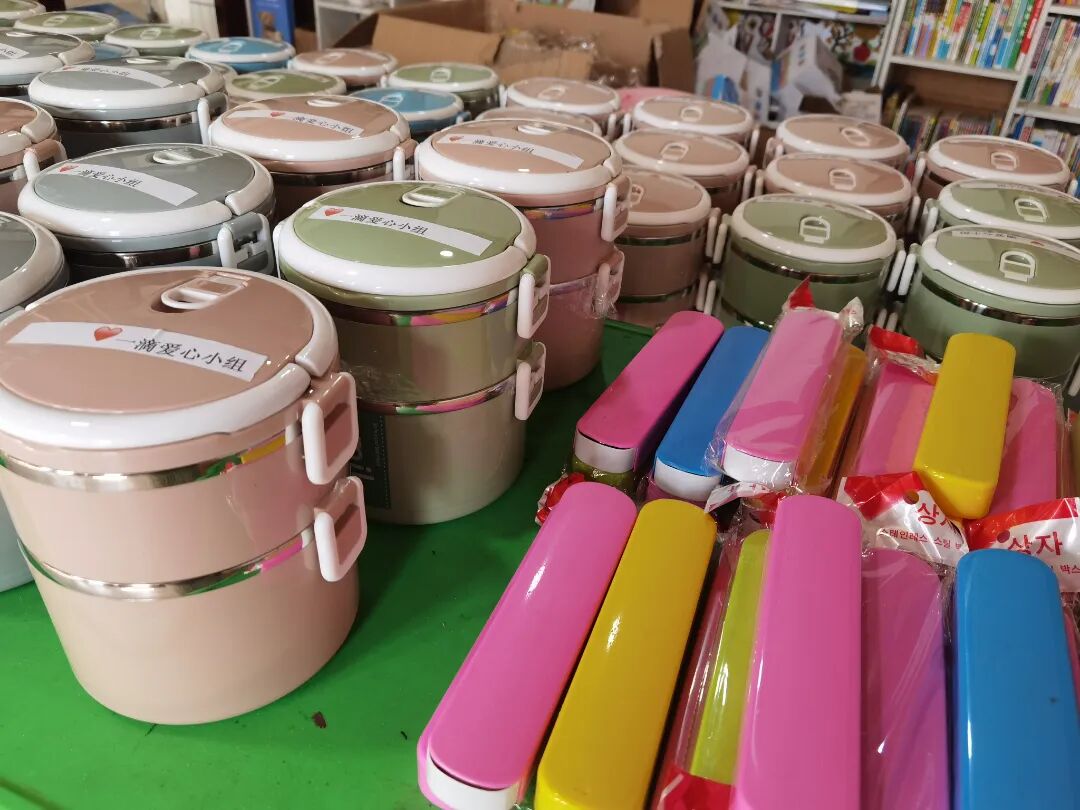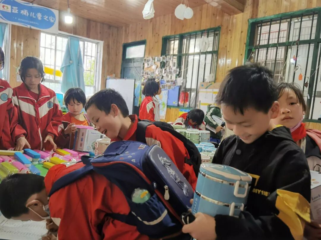 了解到小朋友们可以自己带饭去学校,团队成员立即行动为小朋友们购买保温饭盒,冒着大雨送来儿童之家。而这一切,都是希望小朋友们能够开心无忧地长大,感谢一滴爱心小组一如既往地守护。