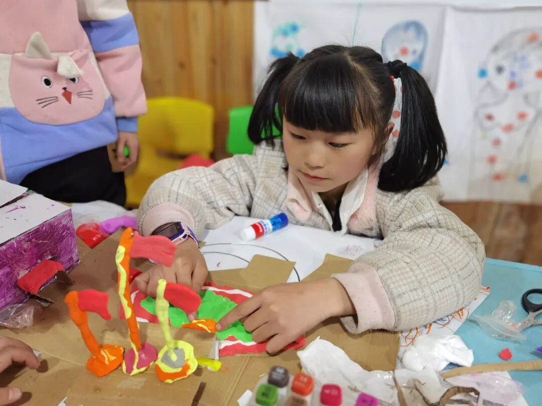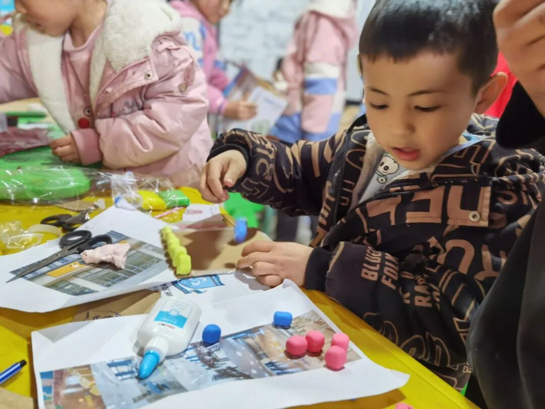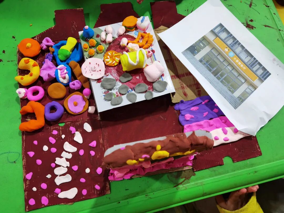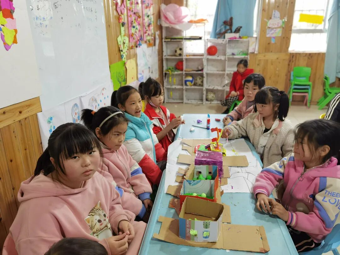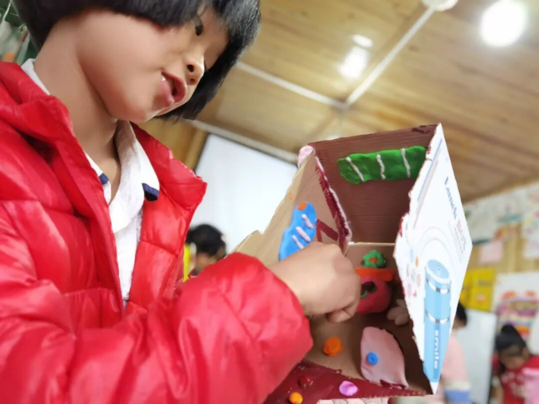 紧接着,小朋友们尝试通过纸箱和粘土,分为“室外景观小组”和“室内特色小组”两个小组。在完成小组讨论和分工后,根据图片去手工呈现新学校的模样,制作的过程小朋友们也是脑洞大开,增添了很多色彩和元素。