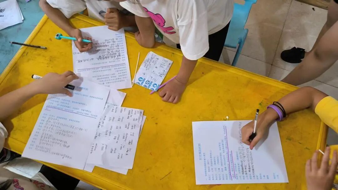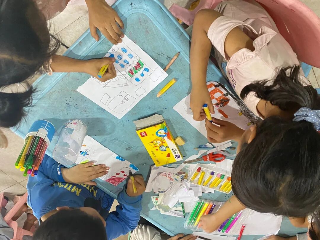 情景创作之后,小朋友们分为两组,文本组和绘画组,共同制作安全手册。