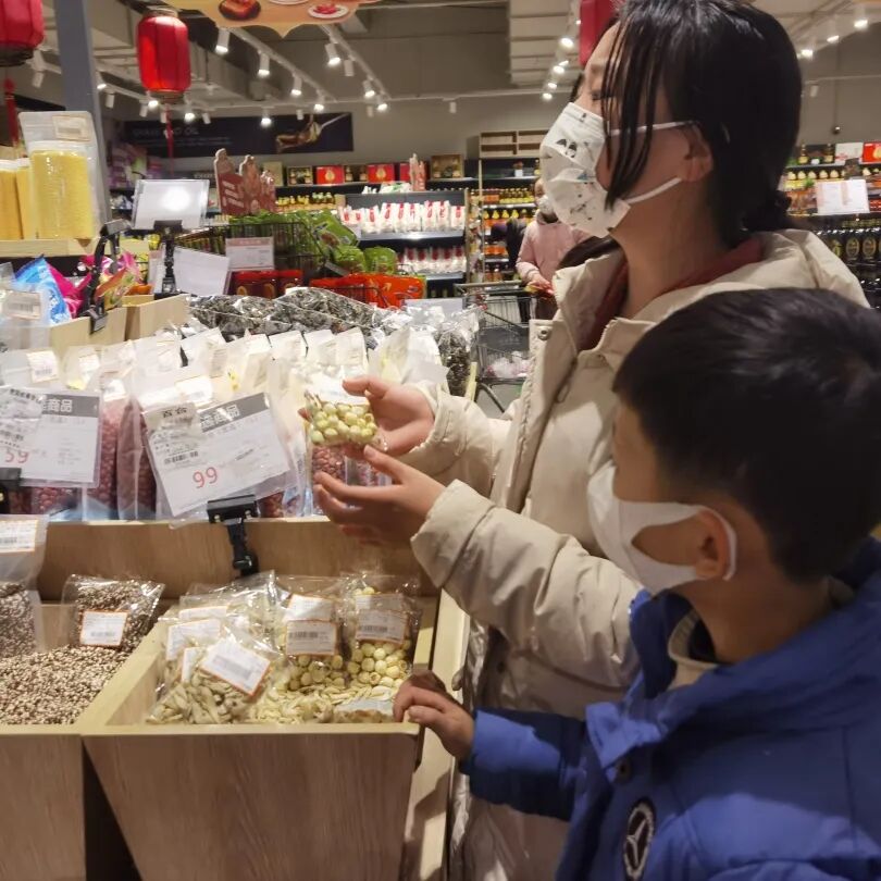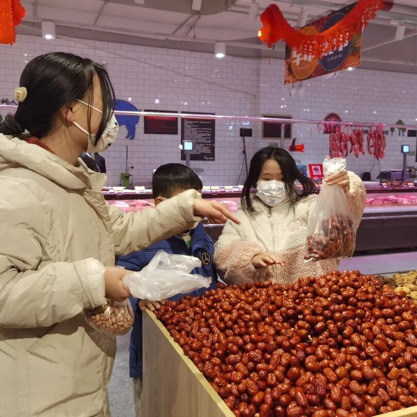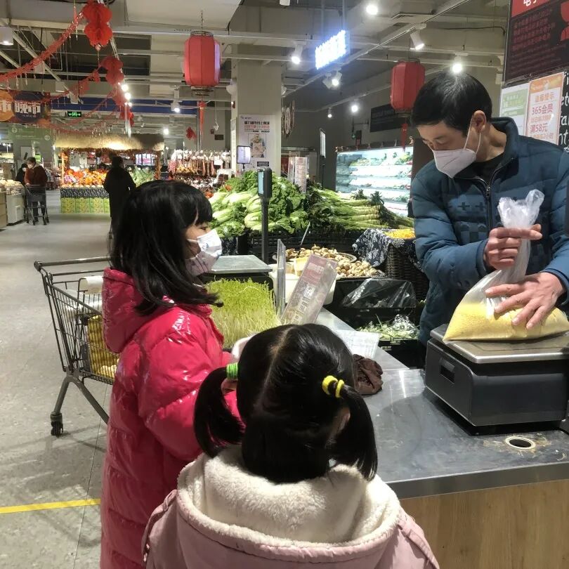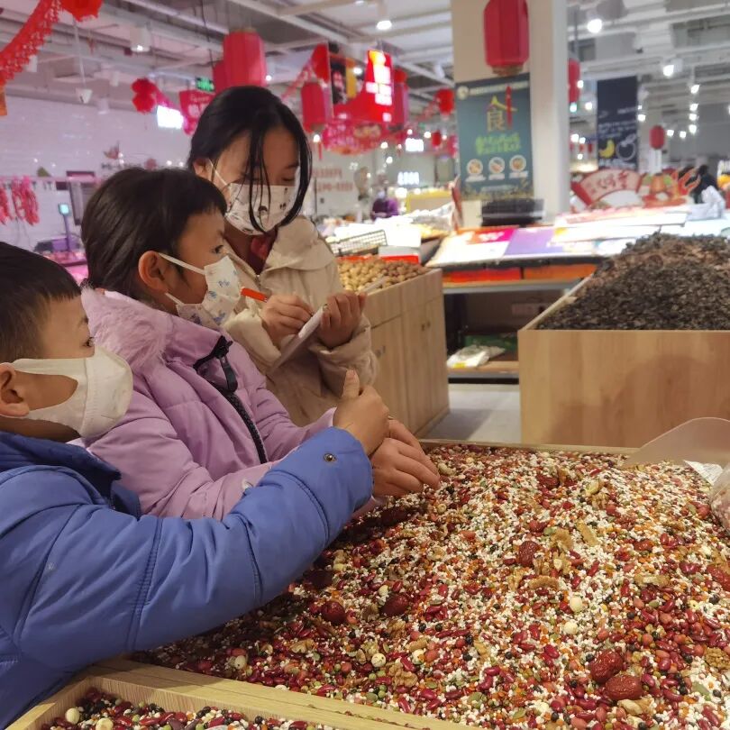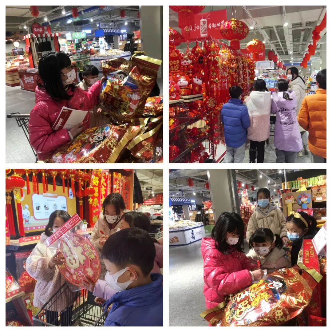 除了采购腊八粥食材之外,我们还有另外一个任务,那就是“置办年货”。小朋友们需要在超市琳琅满目的物品里挑选年货,春联、窗花、灯笼能带来满满的年味,小朋友们挑来选去半天,对比着哪个更实惠。接着选牛奶、选零食,还想着买纸杯招待客人,小朋友眼中的年货还挺周到。
