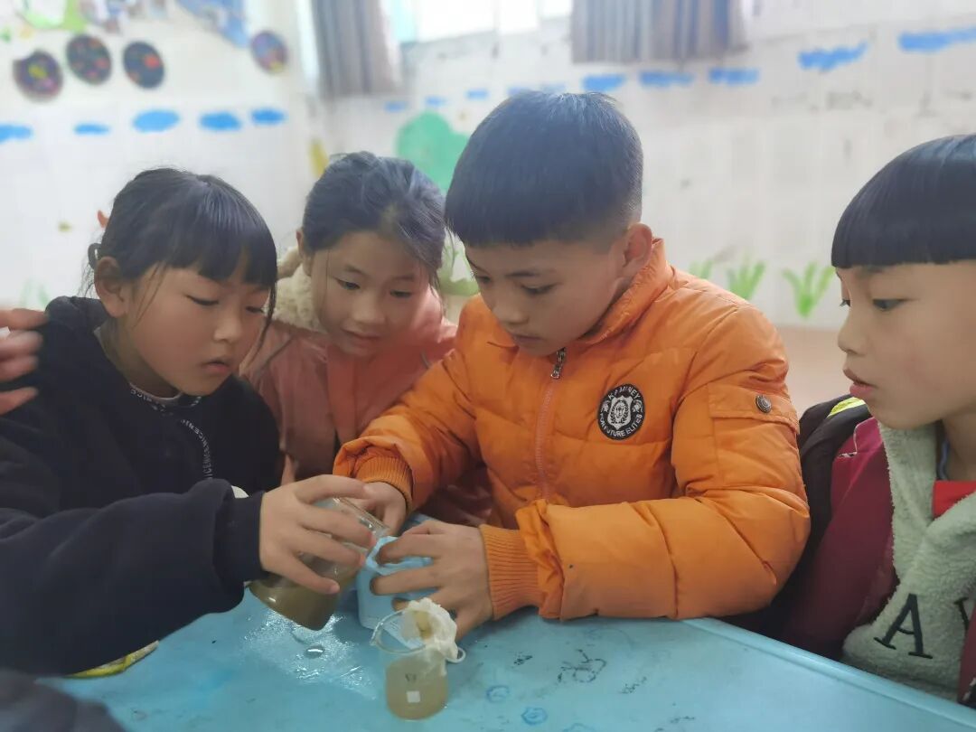 在实验中,小朋友们观察到没有植被的泥土加入清水后流出的水变得浑浊,而有植被的泥土加入清水后流出的水相对清澈。但是由于刚下过雨,泥土相对湿润,所以也有一些小组呈现出了不同的结果。