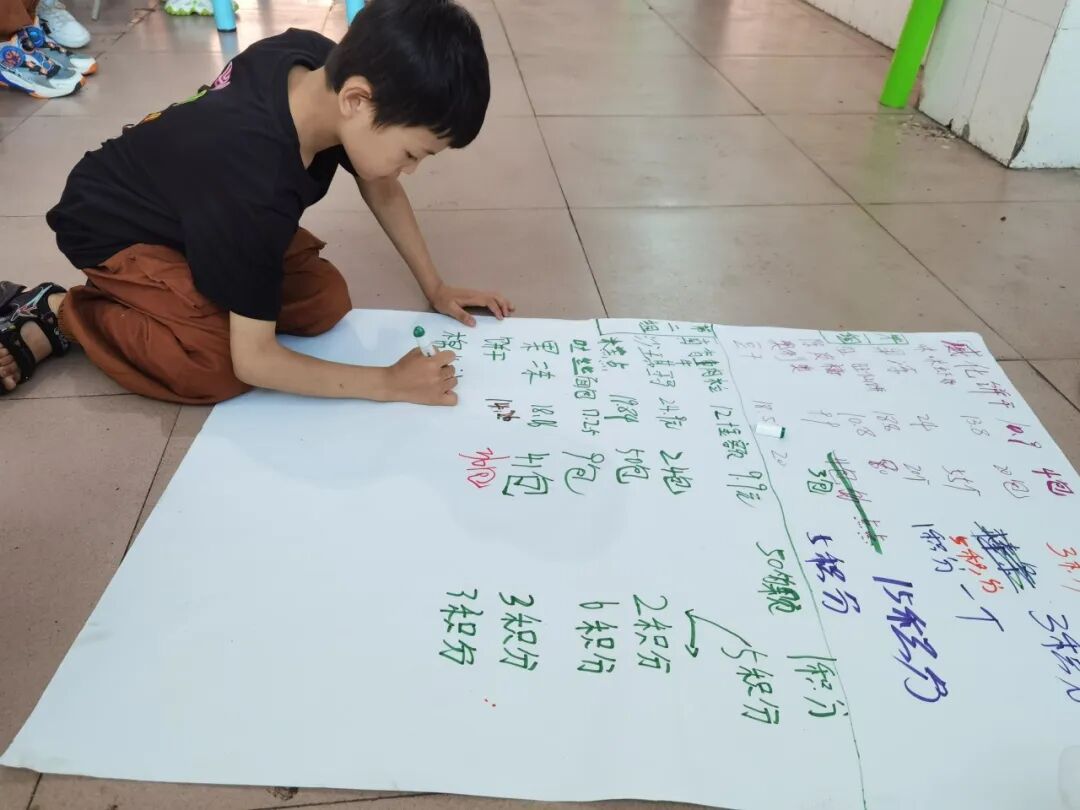 活动最后,我们开展了小组购物分享环节,每组选派代表分享自己组的购物经验、所购买的商品种类和价格。随后,依据单个商品的价值,与全体儿童共同讨论赋予对应的积分兑换标准并做好积分兑换表记录。