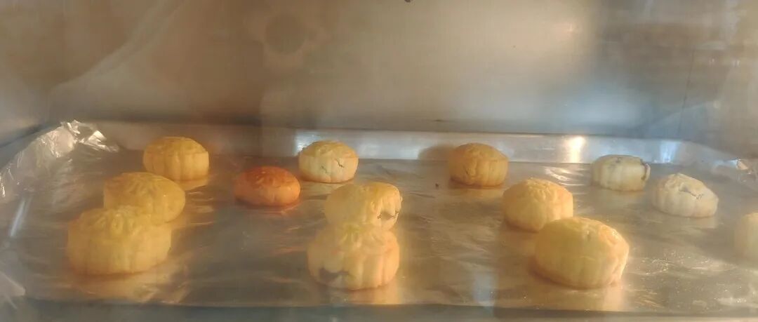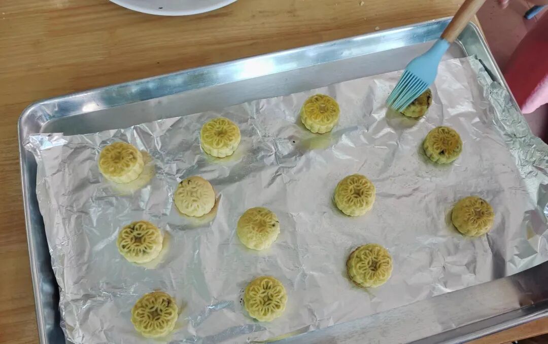 包好的月饼喷水放进烤箱烘烤,5分钟后取出刷上蛋液,放凉后再进行烘烤。饼皮开始变得焦黄,体积也慢慢变大,我们的半成功月饼出炉,满屋都是月饼的香味。刚出炉的月饼比较硬,放置几天后回油就会变软哦。
