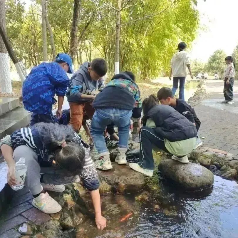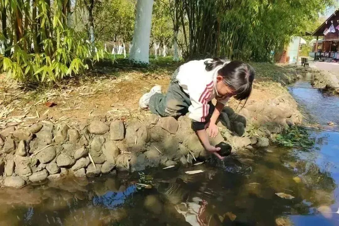 快速的解决午餐后,小朋友们在公园里尽情的探索,到处都是他们的欢声笑语。溪流边,他们在和溪水亲密接触,捉虾摸鱼。落叶丛,他们在和土地亲密接触,探索自然。乐园里,他们和小伙伴肆意玩耍,尽情大笑。