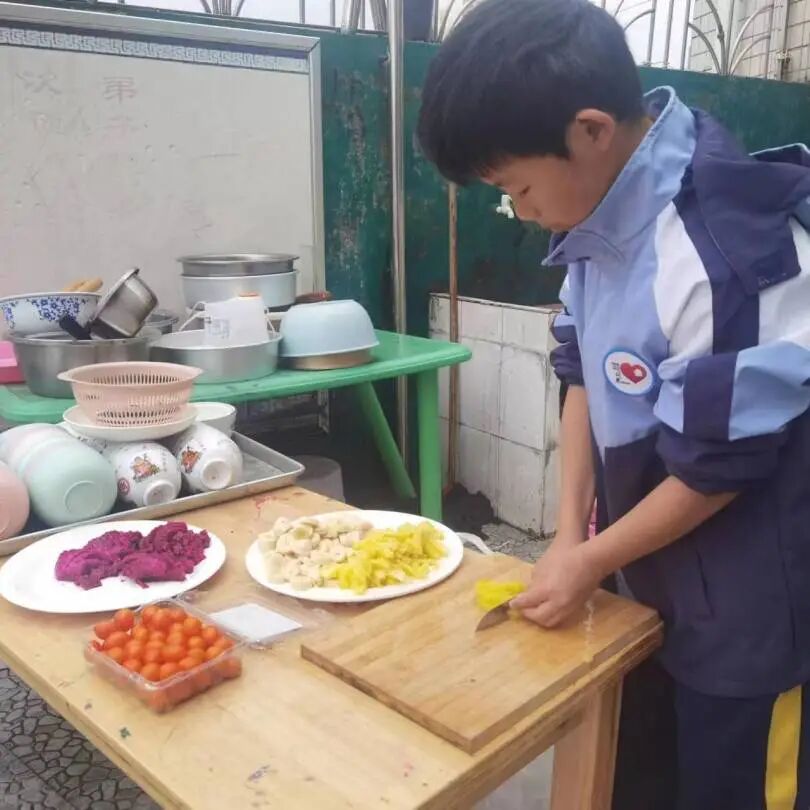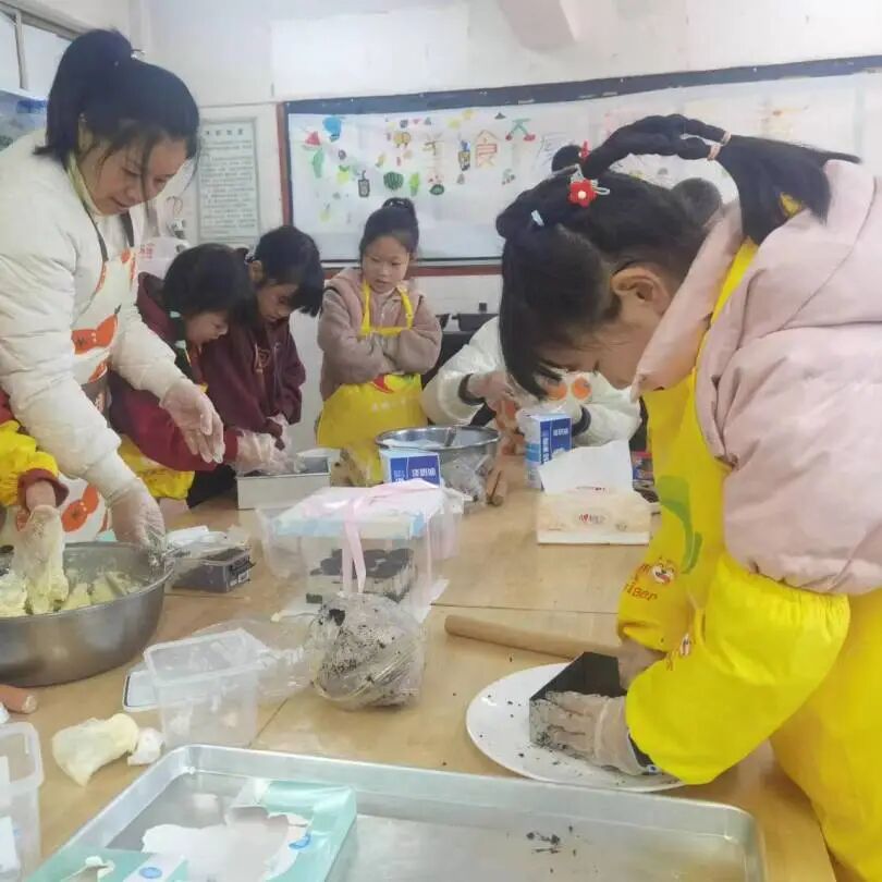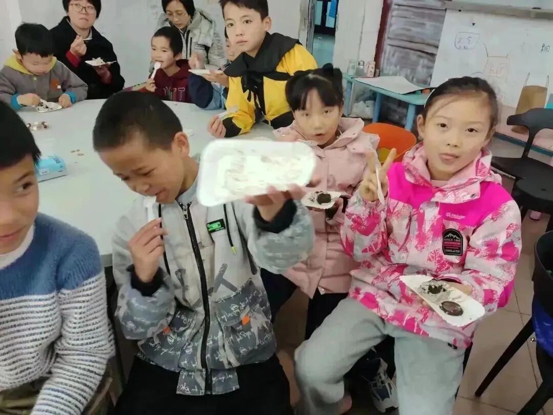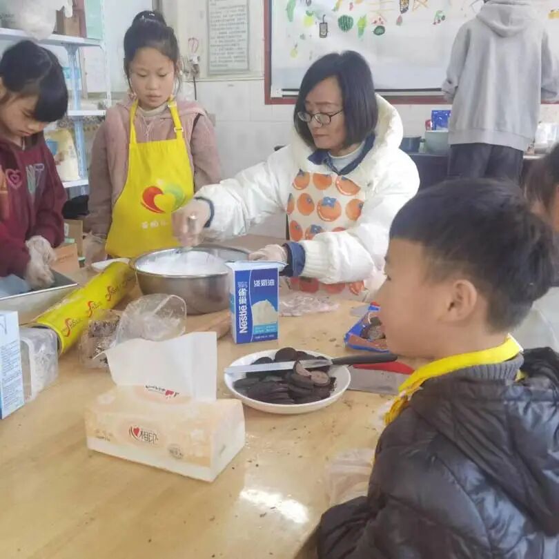 小朋友们分组分工,在志愿者薛老师的带领下又get了新的美食-慕斯蛋糕。人多力量大,我们的美食在小朋友们的通力合作下,很快就完成了。