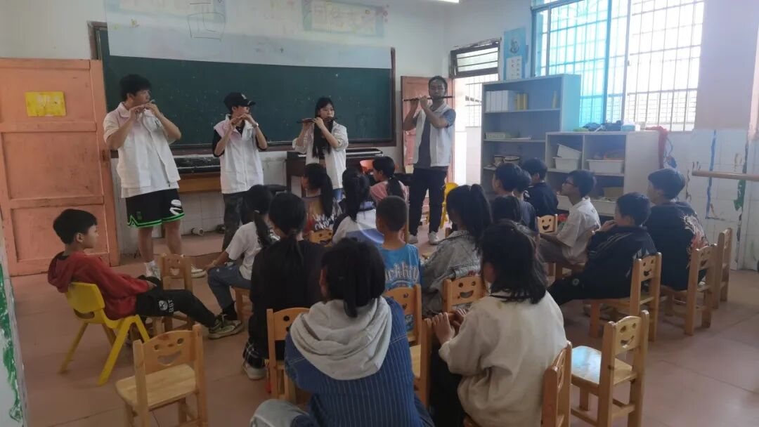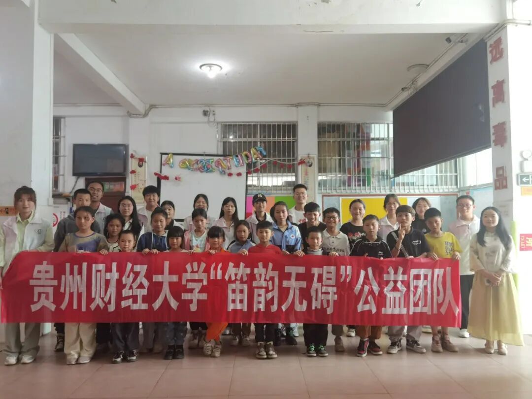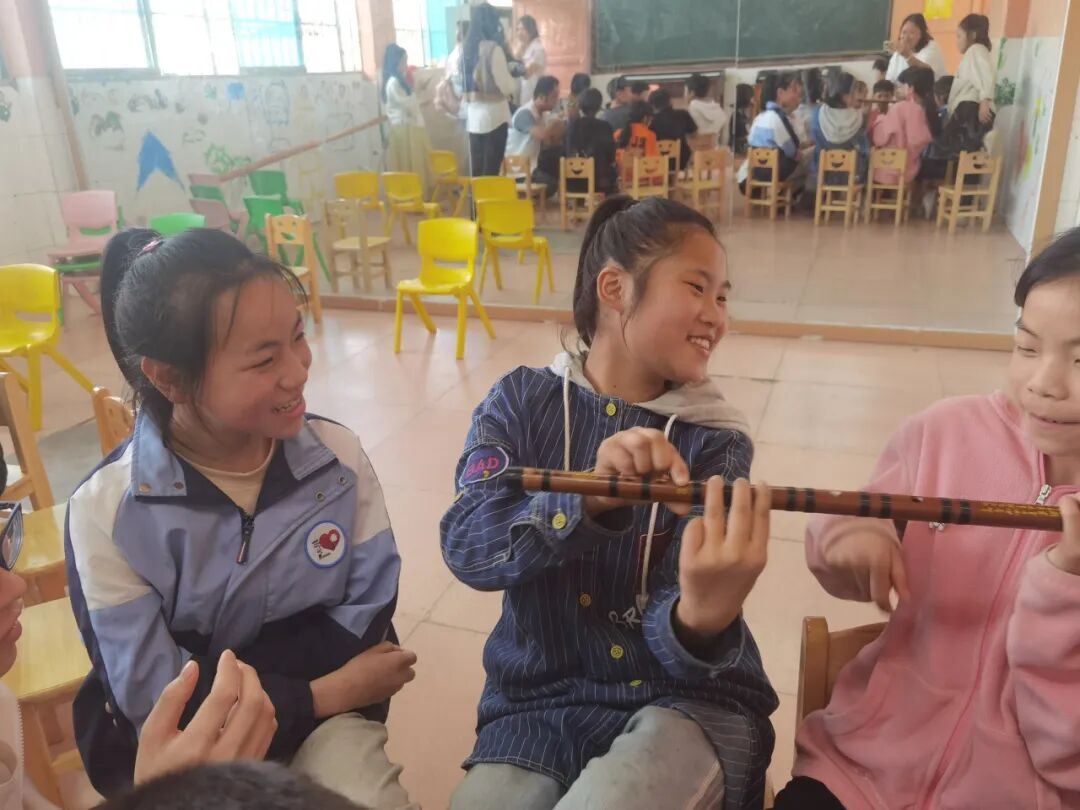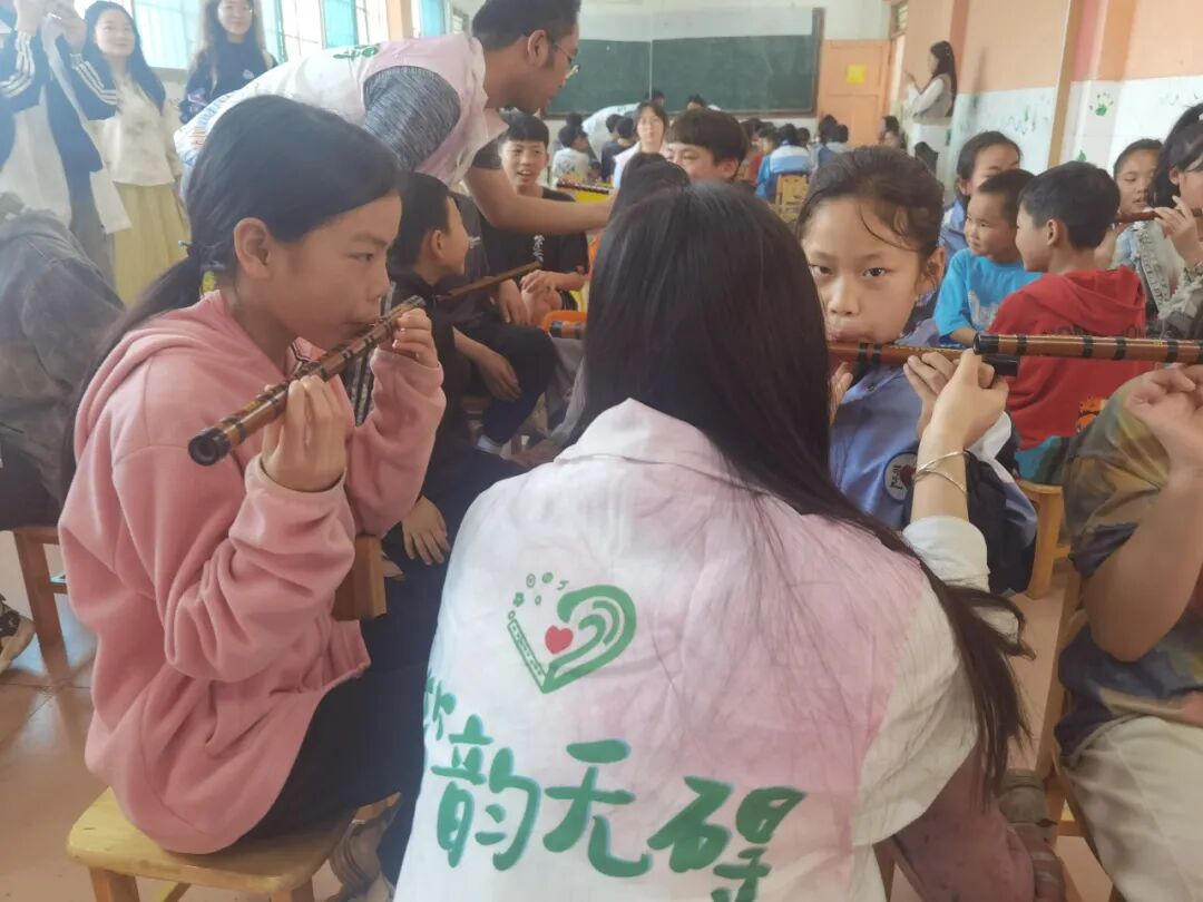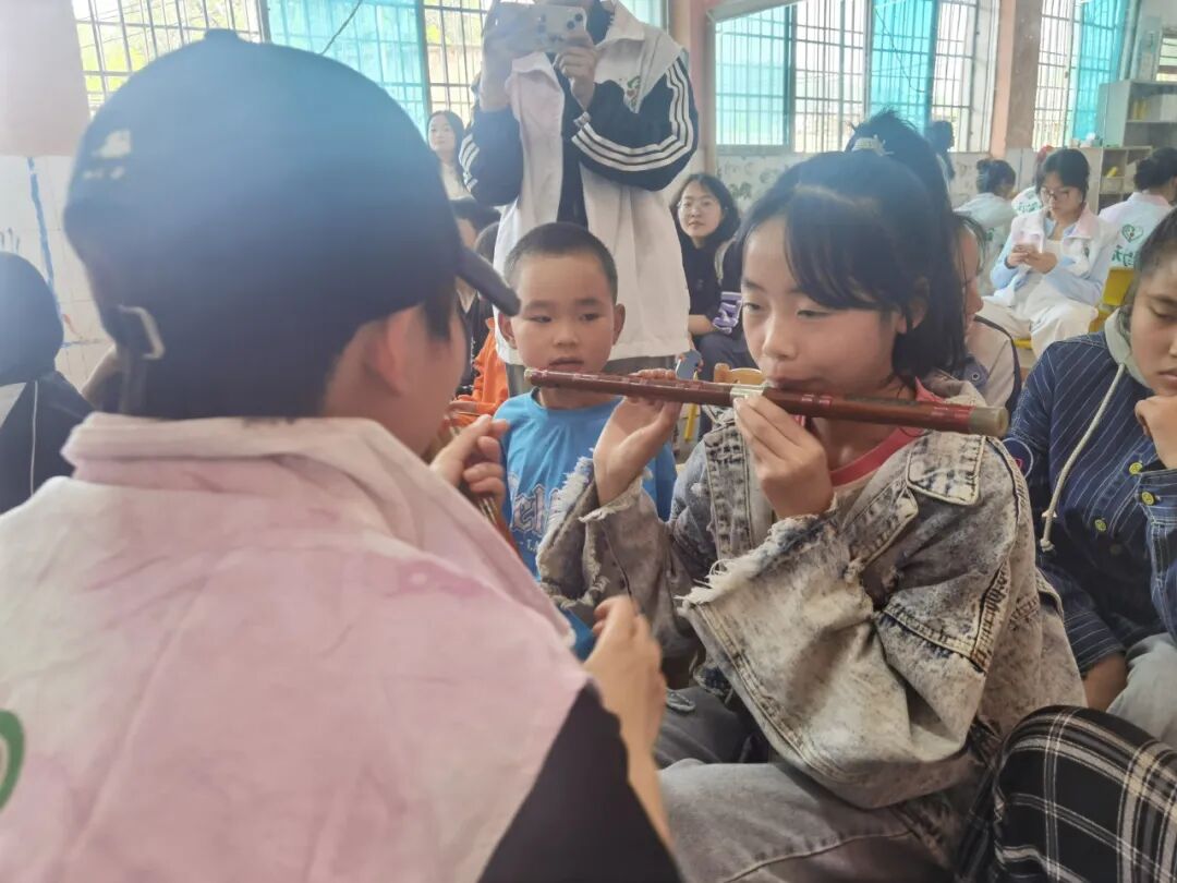 周日下午,贵州财经大学“笛韵无碍”公益团队为小朋友带来了笛子教学活动。
