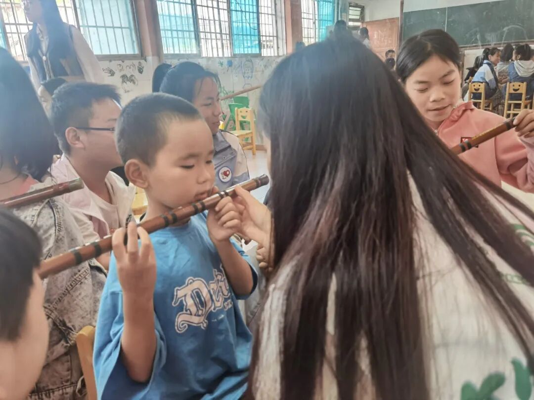大家都认真练习,迅速和哥哥姐姐们打成一片,有不会的马上询问,小朋友们从吹不出声音到能吹出一两个音节,练习的面红耳赤。快乐的时光转瞬即逝,哥哥姐姐们准备离开时,小朋友们还有些意犹未尽。大家对于笛子的喜爱是我们之前没有意料到的,除了认真学习,事后好几个小朋友都来问可不可以帮他们买一根笛子练习,这是小朋友们少有的主动,也让我们更加期待之后的笛子活动啦。