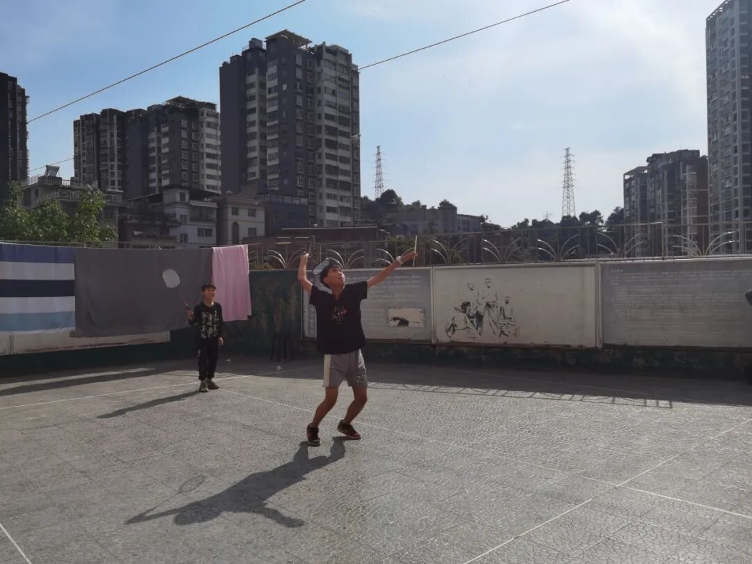 只看见羽毛球在空中自由地飞舞了起来,我们低年级的小朋友在球场上挥动着手臂,来回移动。