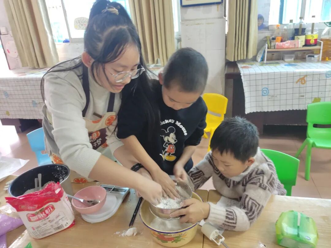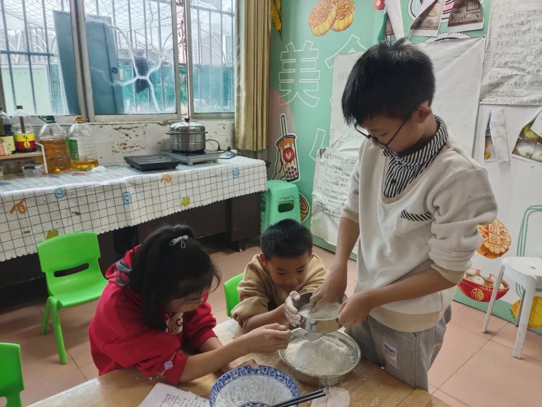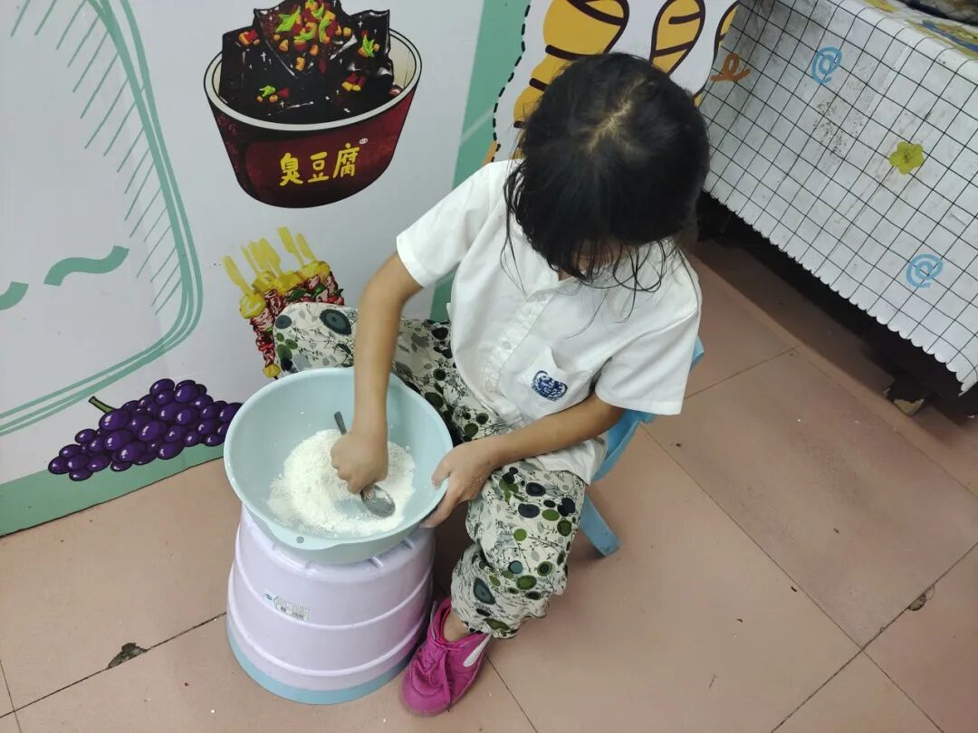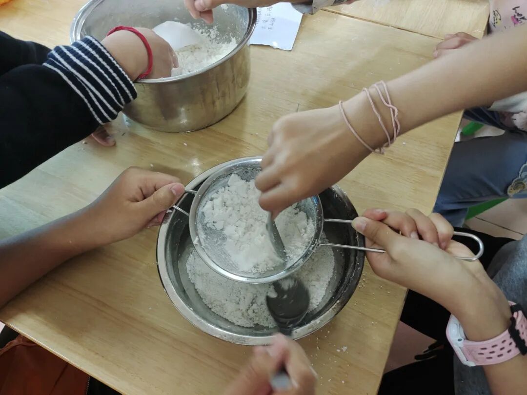 小朋友们先通过视频学习了解重阳糕的制作步骤,再分组进行制作。大家观看视频选取了三种重阳糕,分别是豆沙、紫薯、蜜枣,各小组记录下自己的制作步骤和食材配比,我们重阳糕的制作就开始了。每个小组在组长的指挥安排下,称重的称重、搅拌的搅拌、过筛的过筛,一切都有条不紊。