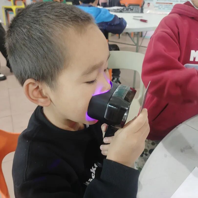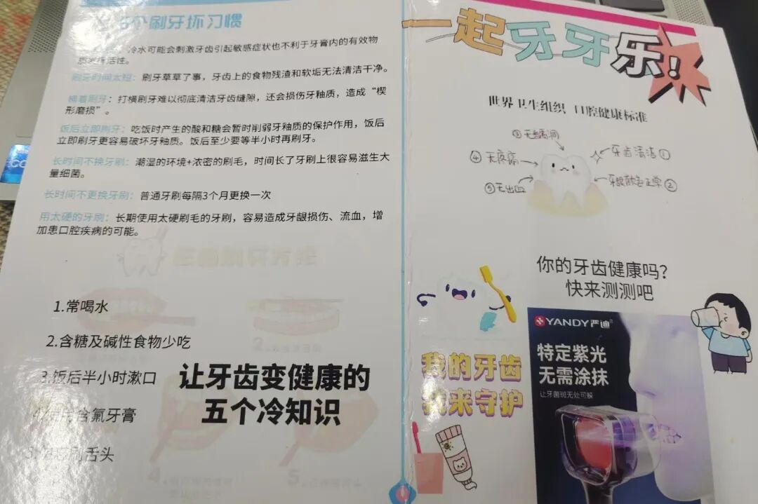 小朋友们先使用牙菌斑检测仪检查自己的牙齿,大家对检查出来的红色斑点感到不可思议,本以为健康的牙齿原来那么“不健康”。检查完之后,大家将自己的牙菌斑画在纸上,开始互相参观,看看谁的牙齿最健康。“我的上面一排全都有”“我的是下面,门牙旁边那几颗”“我的有四颗”“我只有两颗”“我们轩轩的最少,看来他的牙齿最健康”。