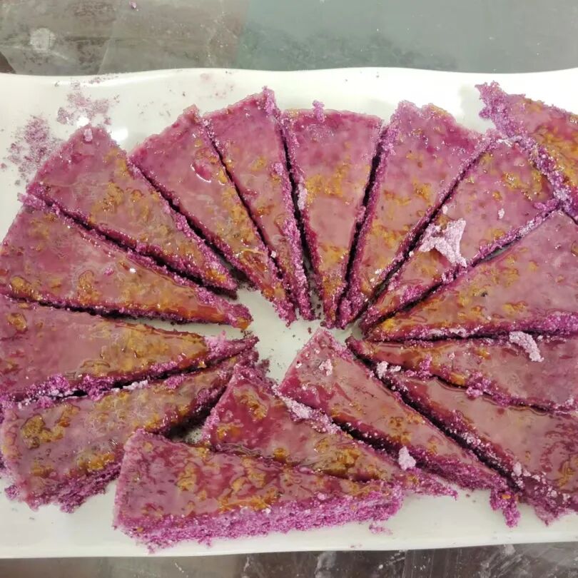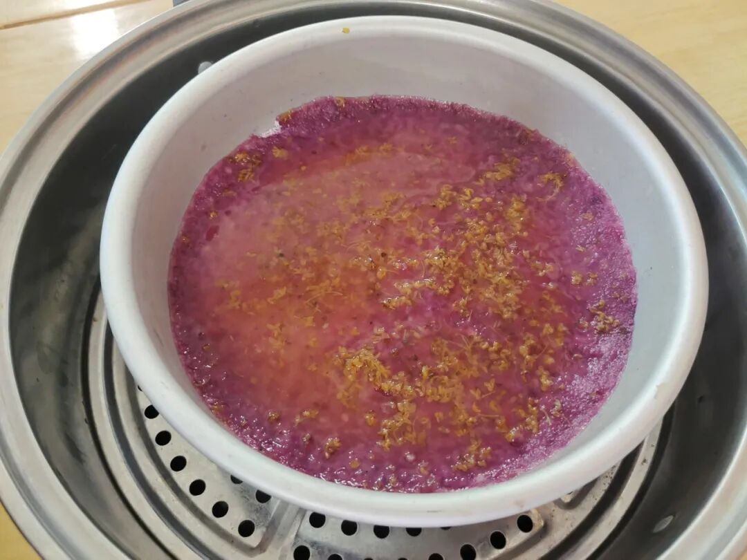 但也有意外情况发生,我们紫薯小组就在老师没有注意到的时候,将所有面粉都加入了紫薯粉,重阳糕变成了紫薯糕。