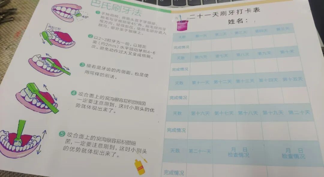 小朋友们的牙齿或多或少都有牙菌斑,而牙菌斑通过正确的刷牙方法是可以减少的。大家都希望学习正确的刷牙方法减少自己的牙菌斑,小朋友们领了自己喜欢的牙刷,跟着视频学习巴氏刷牙法。只见他们拿着牙刷,上刷刷、下刷刷,横刷刷,大家都学会了正确的刷牙方法,再搭配为他们制定的二十一天刷牙打卡表,让我们期待二十一天之后小朋友们牙齿的变化吧。