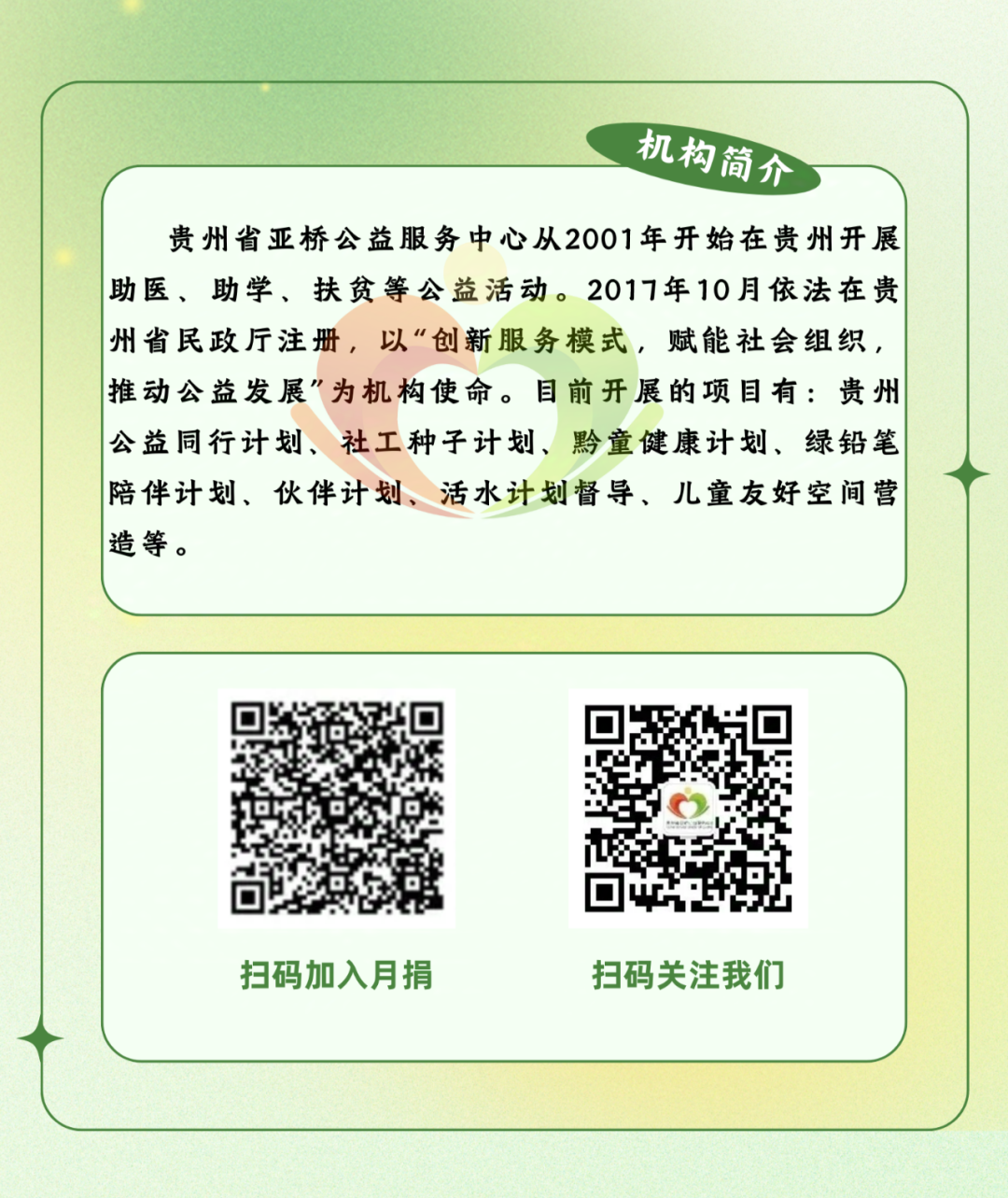 亚桥儿童之家成立于2021年6月1日,由贵州省亚桥公益服务中心创建,位于贵阳市西瓜村,主要为社区儿童提供课业辅导、阅读交流、兴趣活动、公益课程等服务。