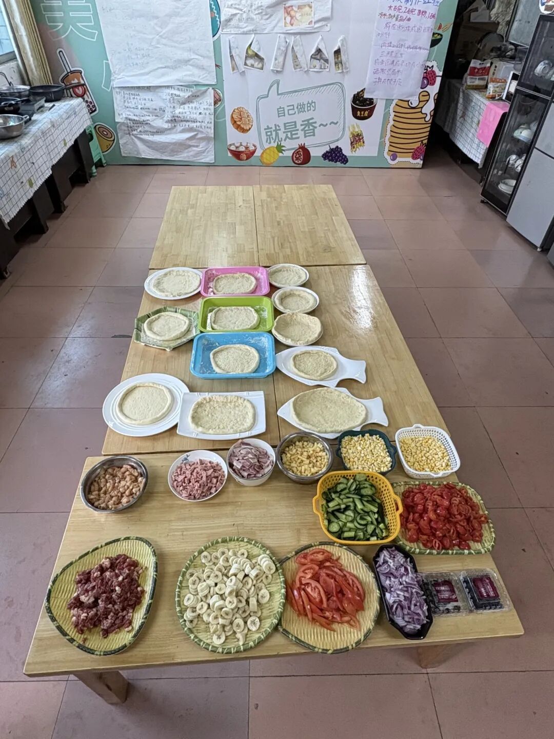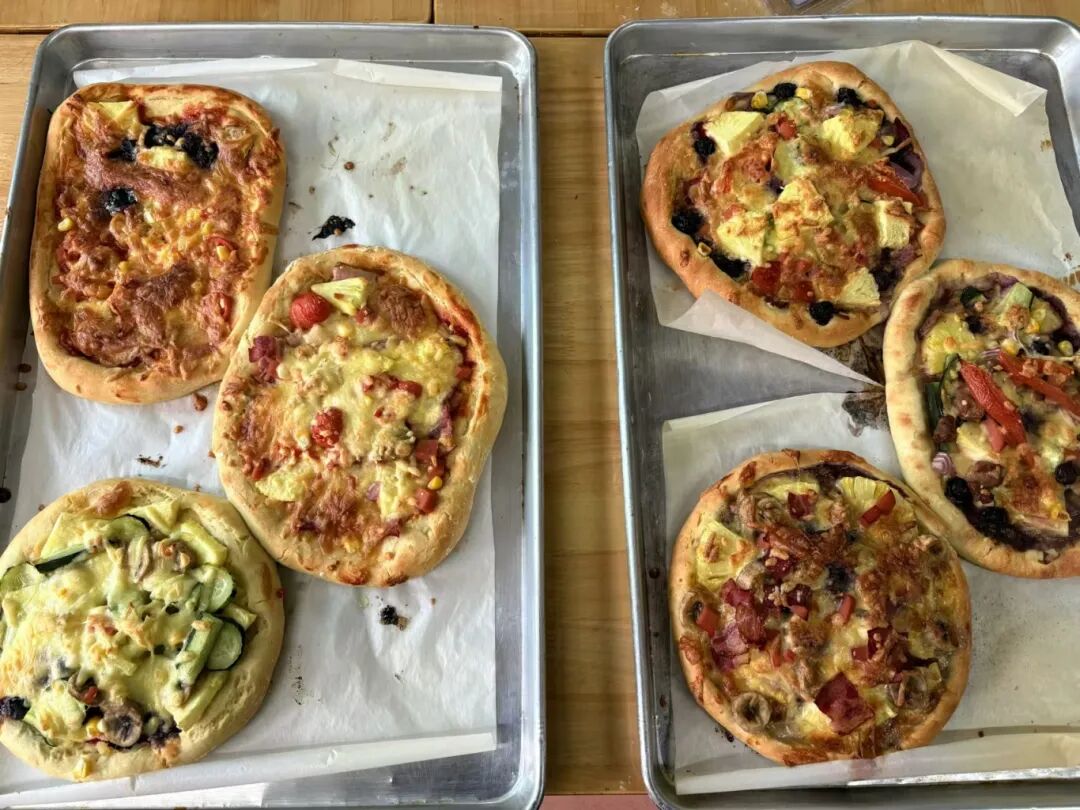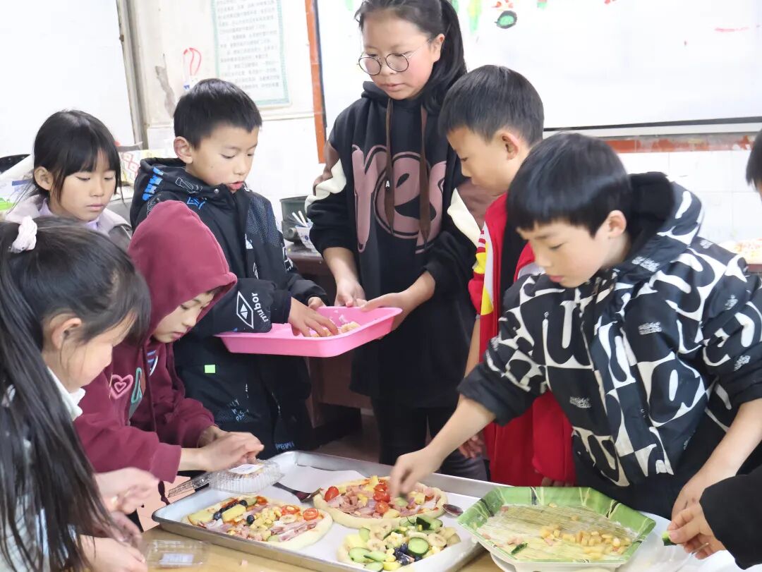 为了满足小朋友想要吃披萨的愿望,儿童之家精心准备了披萨大派对环节。小朋友们自由组队依次进行,每个小团队可以根据自己的爱好和想法来制作披萨,并取了一个喜欢的名字,如“蓝莓芝士披萨”“霸王披萨”“水果派披萨”“培根肉多多披萨”等等。各式各样的披萨烤制好后,我们一起品尝分享,评出了优秀披萨。