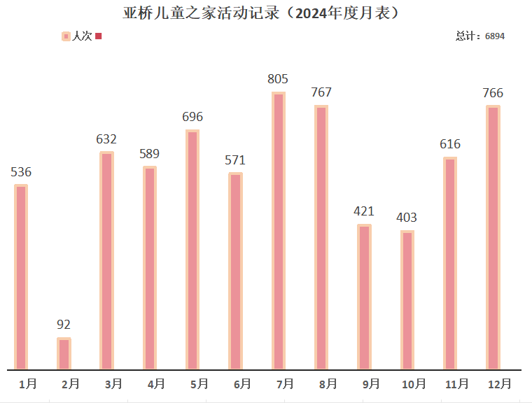 2024年,亚桥儿童之家累计服务儿童6894人次。来自不同家庭、不同背景的儿童在这里找到了属于自己的快乐天地。无论是活泼好动的小男孩,还是文静可爱的小女孩,都在亚桥儿童之家找到了归属感和成就感。