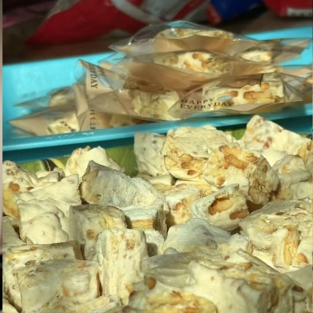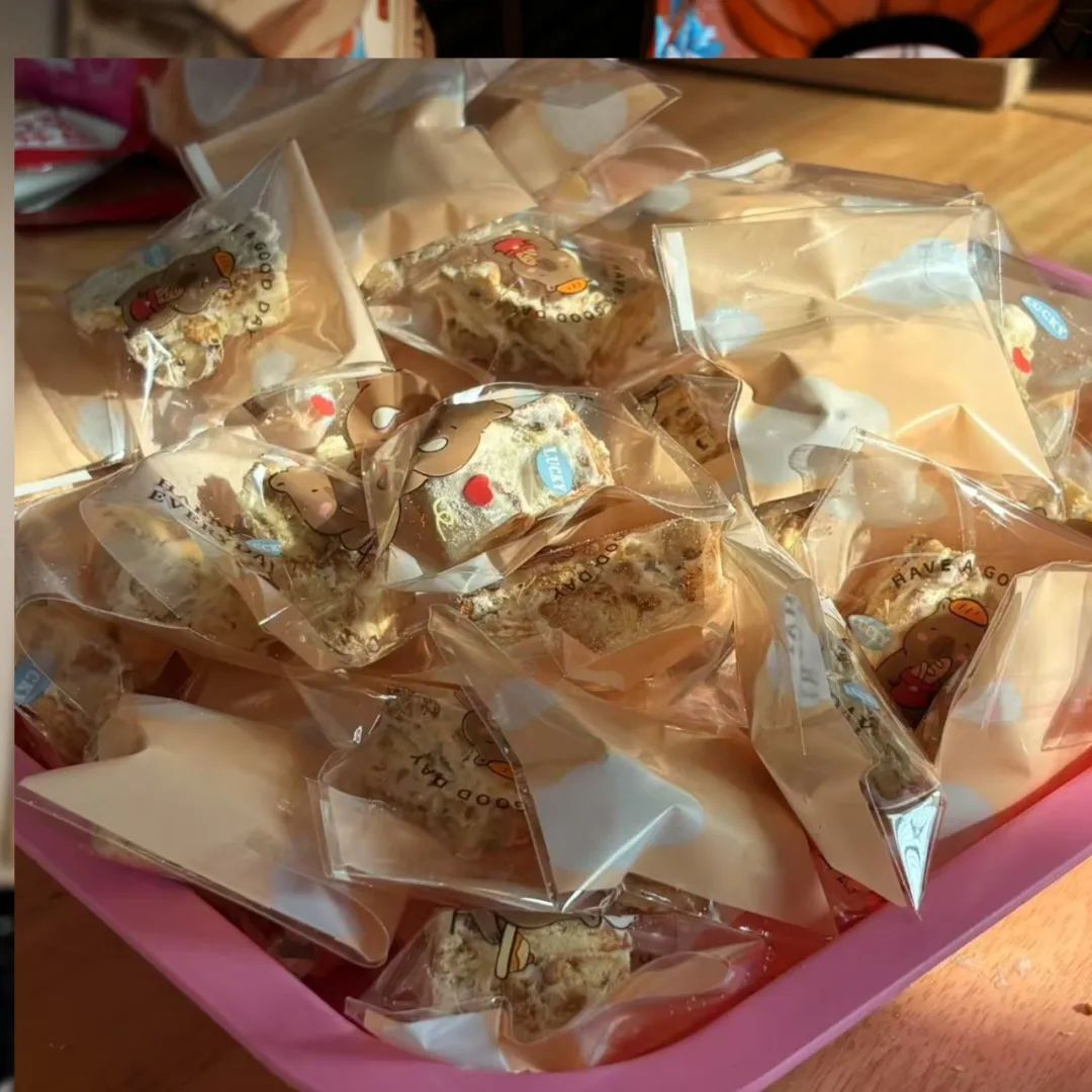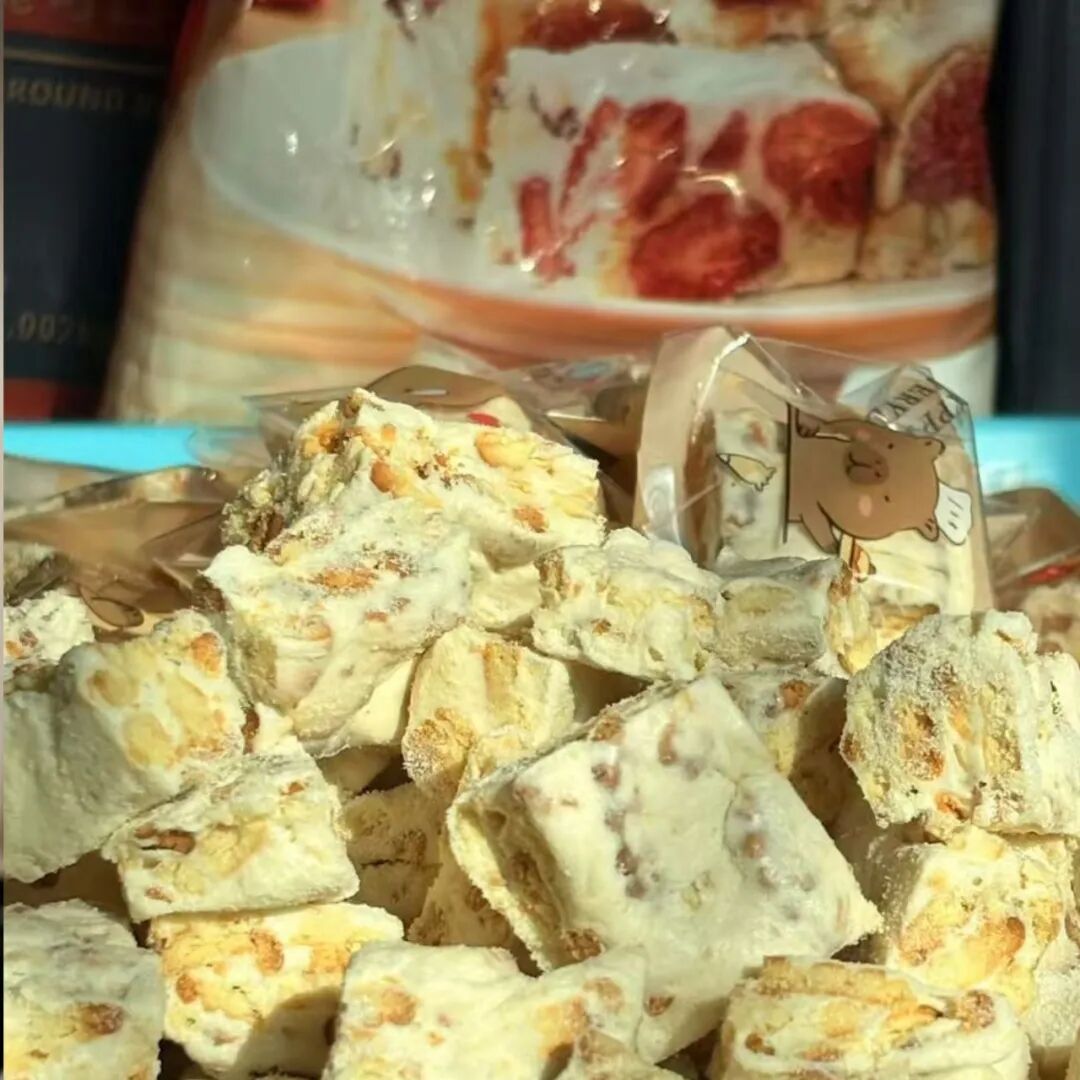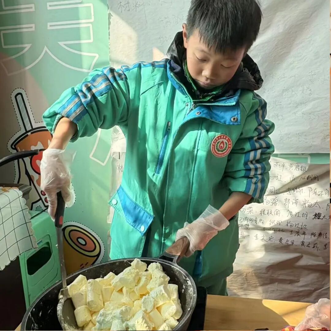 随着电磁炉上小火开启,一锅金黄色的棉花糖渐渐融化,奶粉如雪,坚果、饼干、抹茶粉、可可粉也随后被加入。待小朋友们小心翼翼地塑形、切块、装袋之后,制作好的雪花酥散发着五彩斑斓的光芒,每一块都包裹着我们对新年的甜蜜与期待。