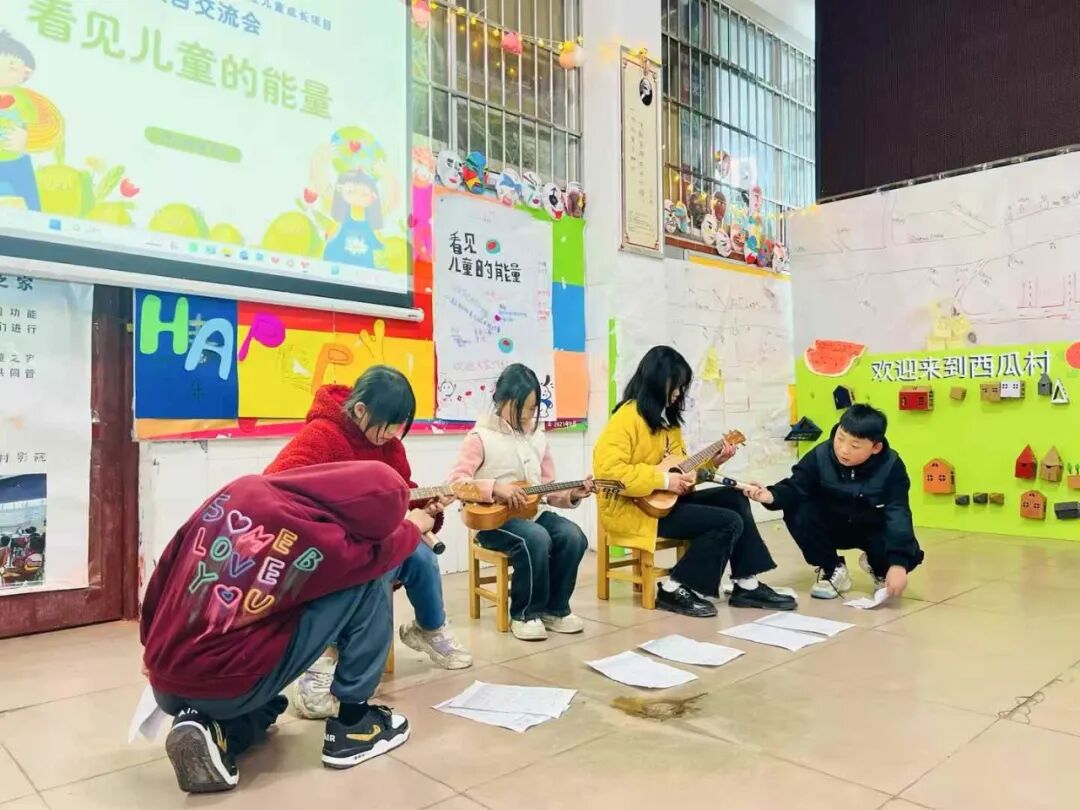 当尤克里里轻快的旋律响起,我们的交流会正式拉开帷幕啦。文艺社的小朋友们所弹奏的歌曲《青花瓷》,瞬间点燃了现场的热情与活力。