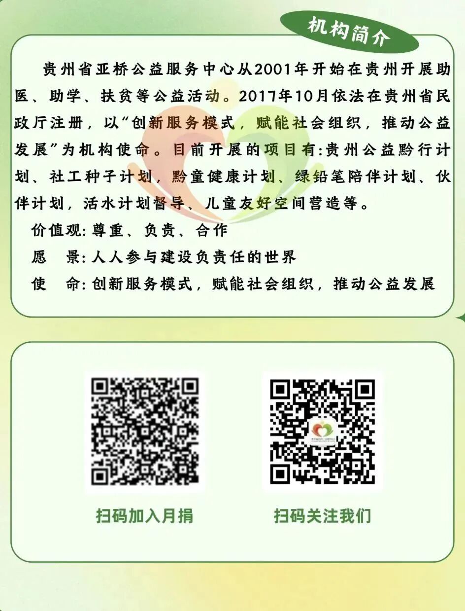 如何加入我们?亚桥儿童之家目前处于建设初期,站点活动和服务还在不断地探索之中。如果你对儿童服务感兴趣,希望加入到我们的队伍当中,你可以选择:1.成为志愿者,支持儿童之家开展活动,为儿童提供绘画、阅读、体育、音乐、课业辅导等支持。不论是个人或者团队,均可报名成为志愿者,详情可联系何老师18786044227(微信同号)。2.成为亚桥月捐人,每月支持我们,一起陪伴更多的孩子快乐成长,让爱心之源长流。