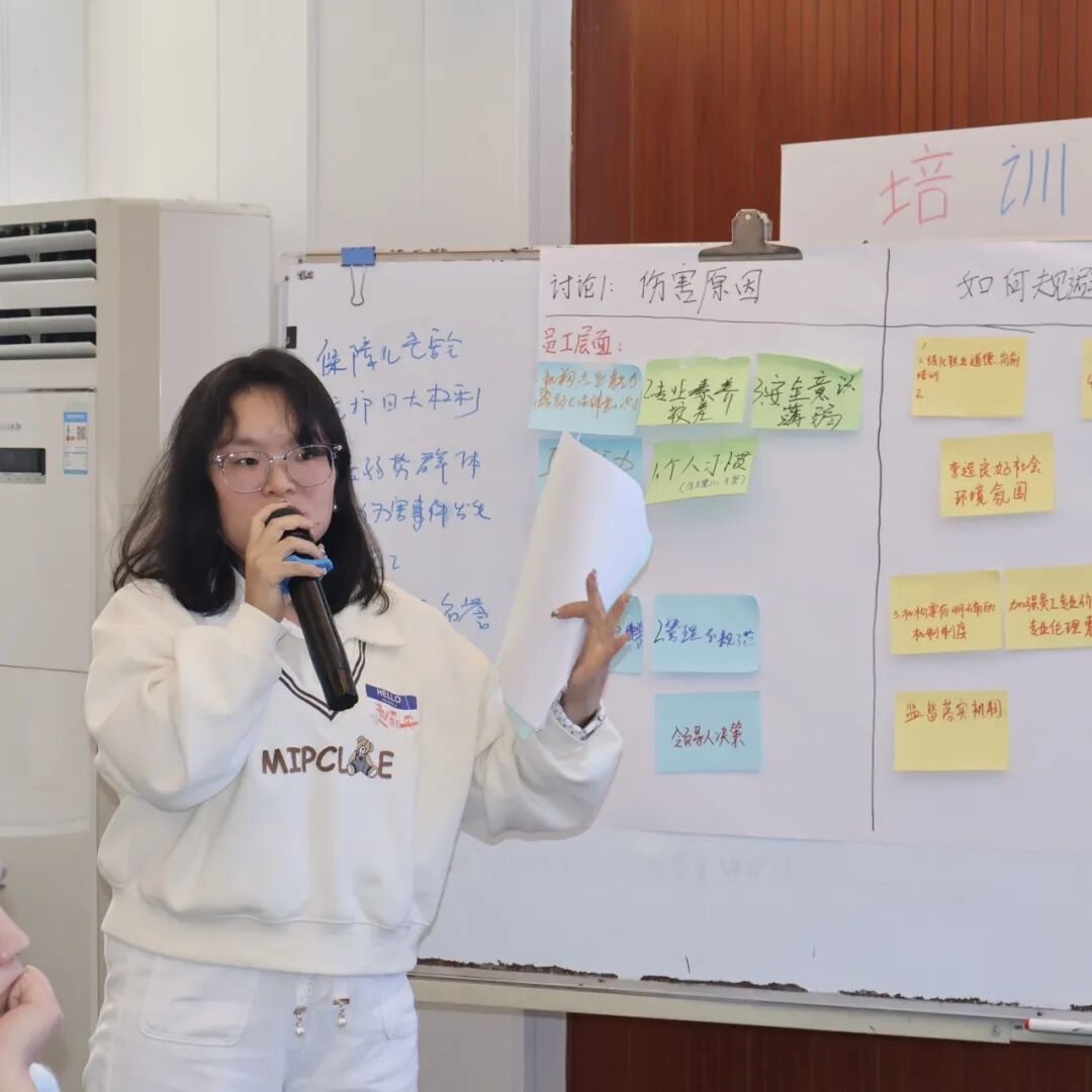 当手指操的口号响起,欢快的氛围瞬间让人恢复精力。从"我划你猜"的欢笑到角色模拟的沉浸,伙伴们在情景演绎中直面服务中的不当行为,探讨不当行为的心理边界。每一次讨论都化作安全意识的火种,以更好地了解并践行儿童服务安全的预防与应对。