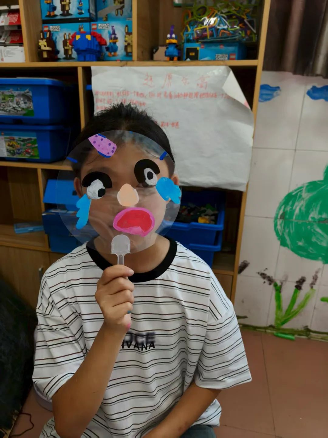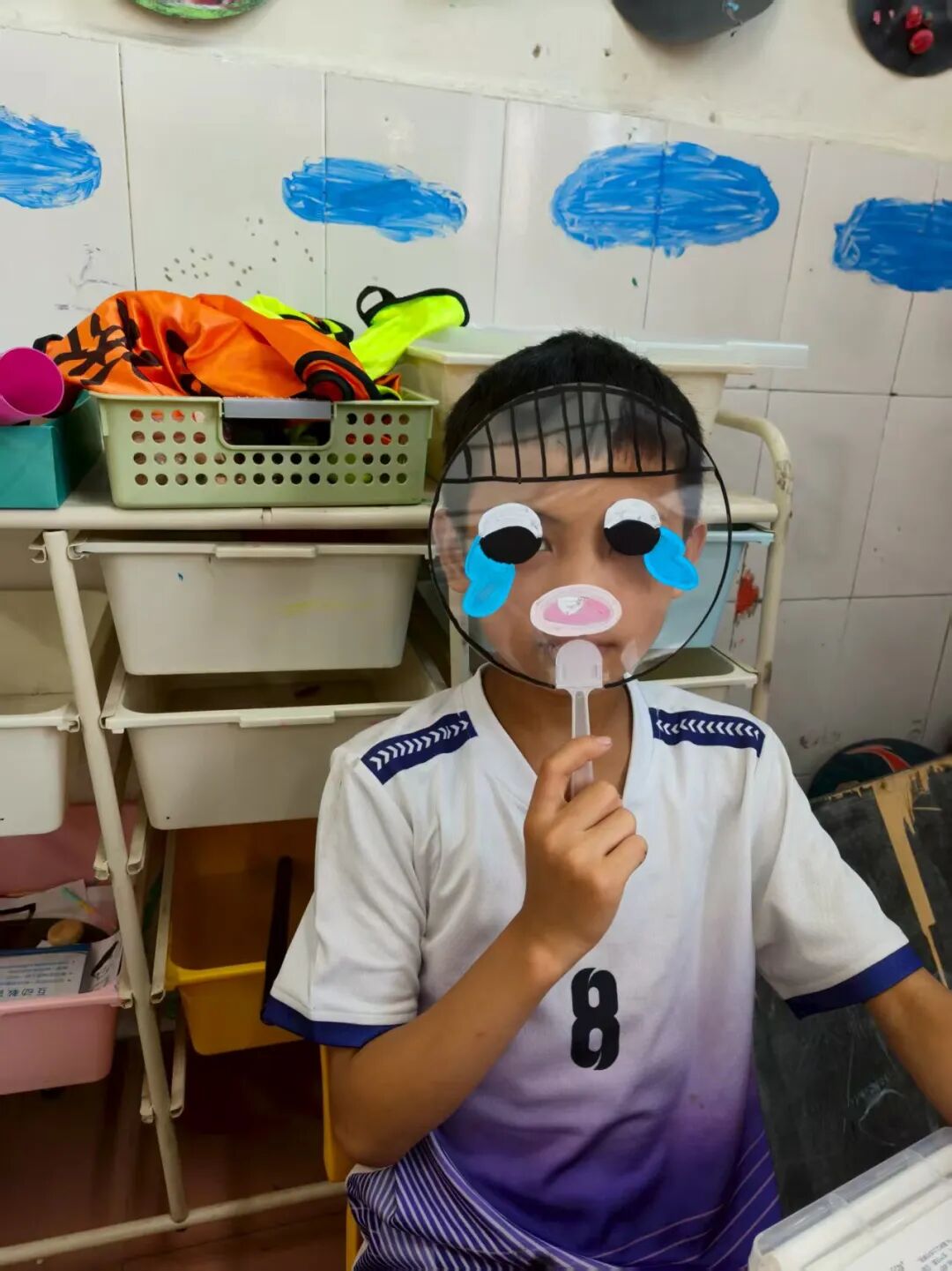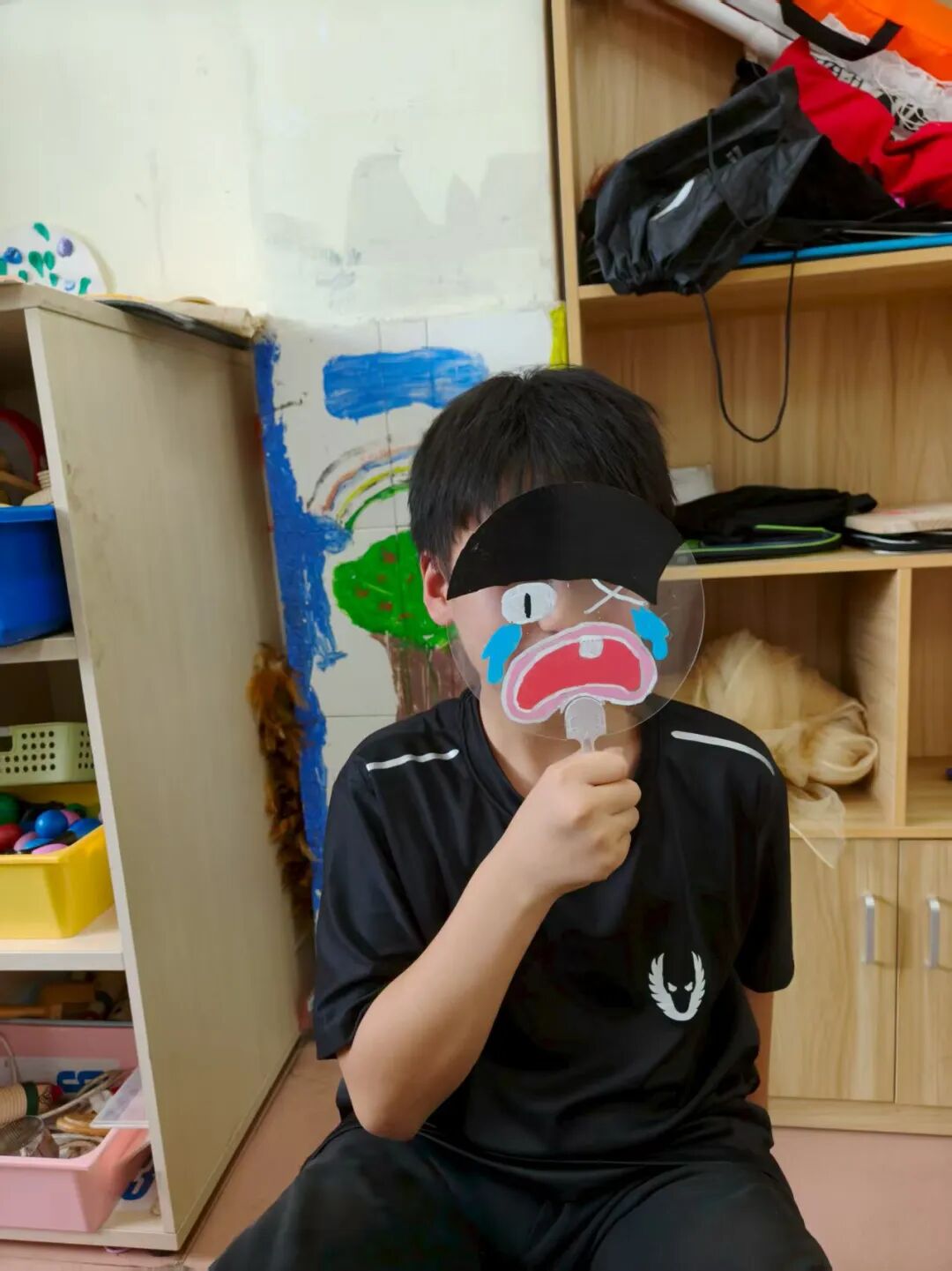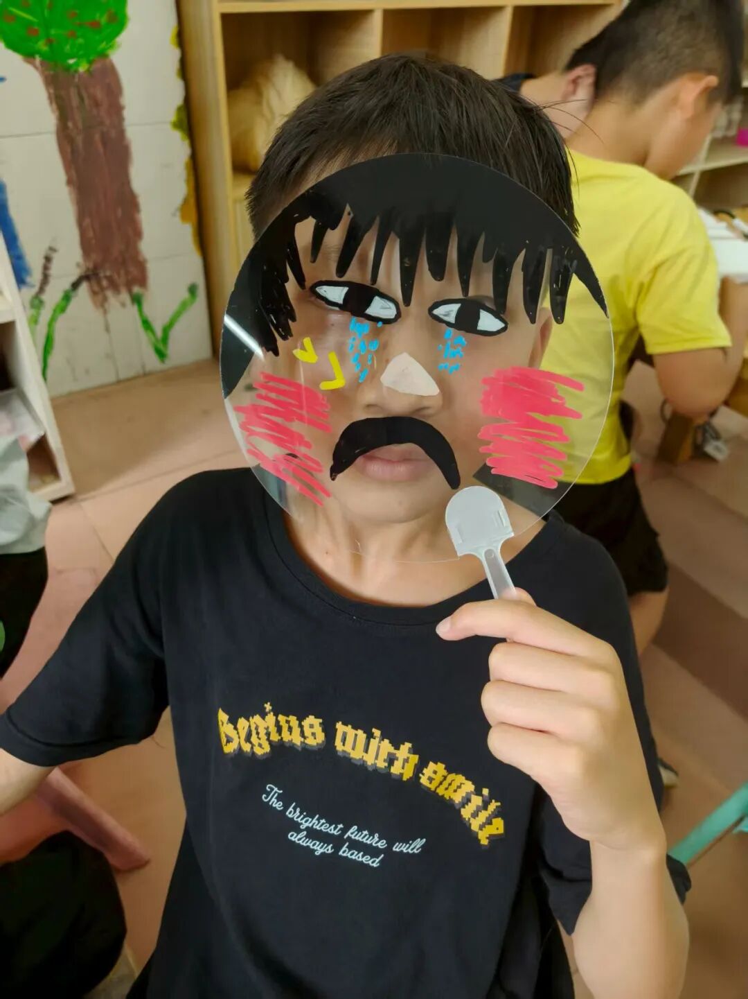 “如果用一幅画代表你的情绪,会是什么样子?” 我们准备了透明扇子、丙烯马克笔和贴纸,让孩子们化身“情绪小画家”。