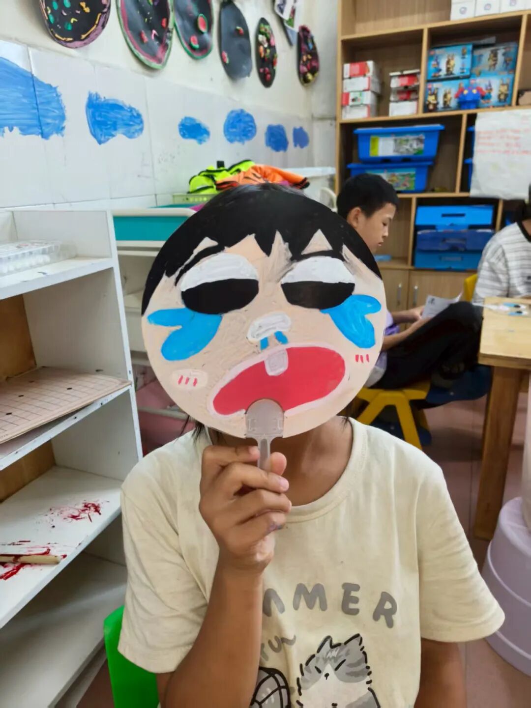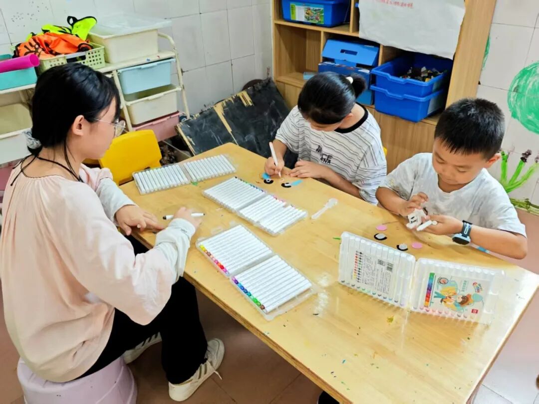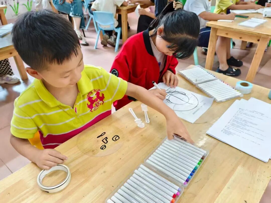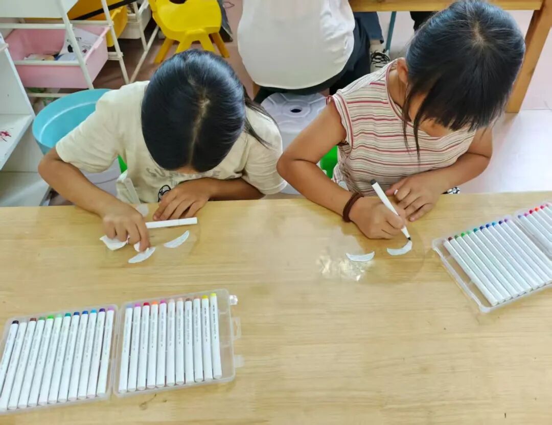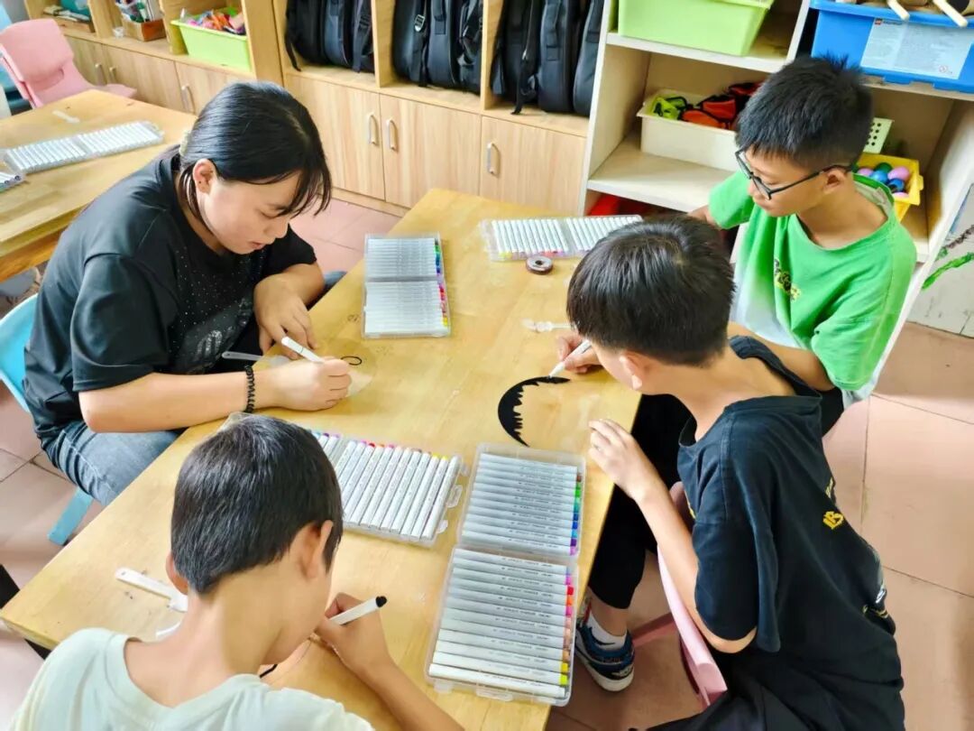 孩子们认真地勾勒着线条、涂上颜色,每一把扇子都成了独一无二的“情绪代言人”。