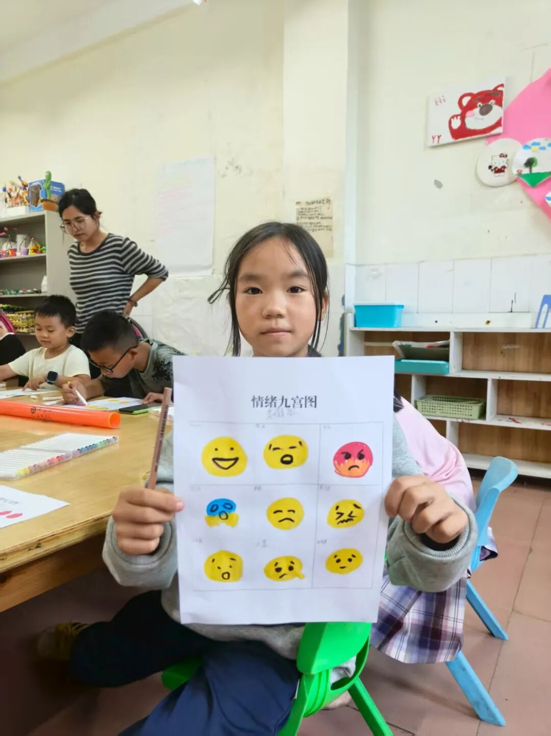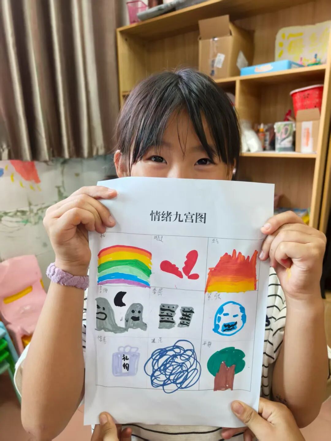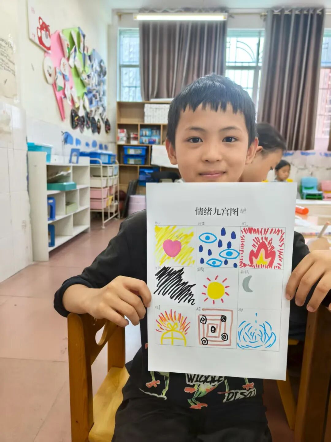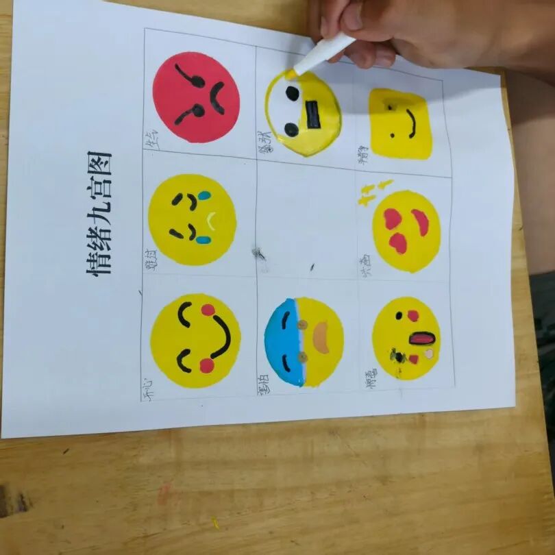 如果说 “说出来” 是情绪的直接传递,那 “画出来” 就是情绪的创意表达。当九宫格画纸和彩笔分到手中,孩子们立刻沉浸在色彩的世界里。