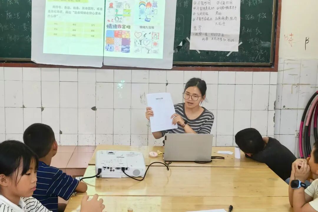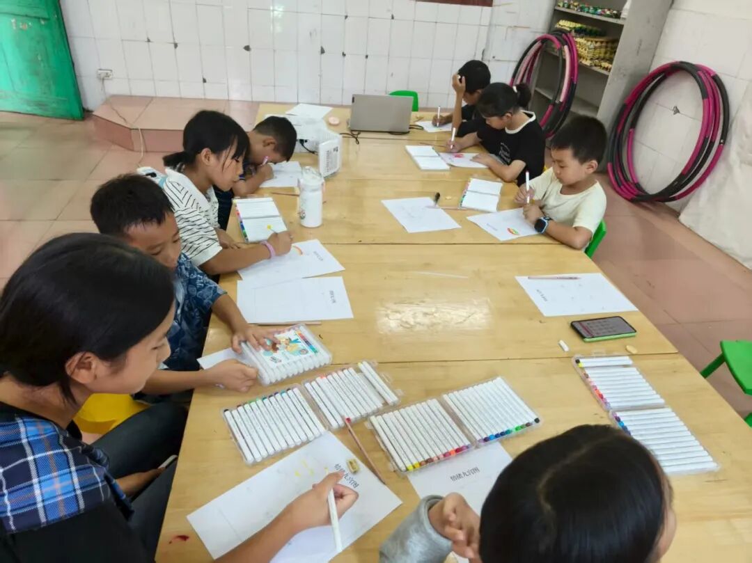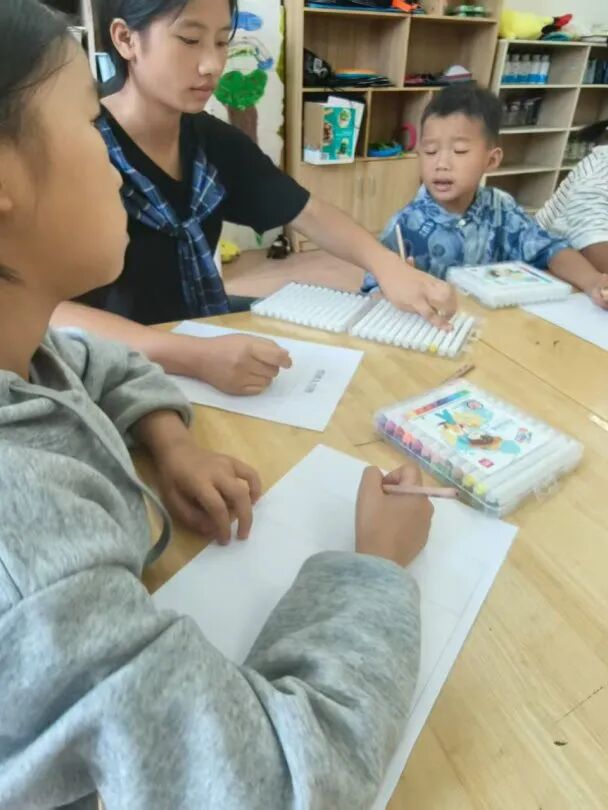 有的孩子用灿烂的太阳画 “开心”,有的用蜷缩的小动物画 “害怕”,还有的用蓝色的雨滴画 “难过”。