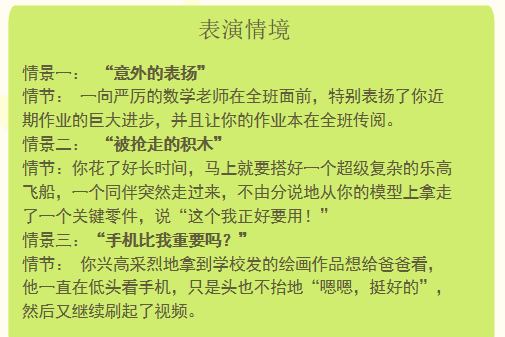 随后的抽取情境卡片练习更是精彩。抽到 “被同学忽视” 的小朋友小声说:“当大家不跟我说话时,我感到孤单,我希望下次玩游戏能叫上我”;