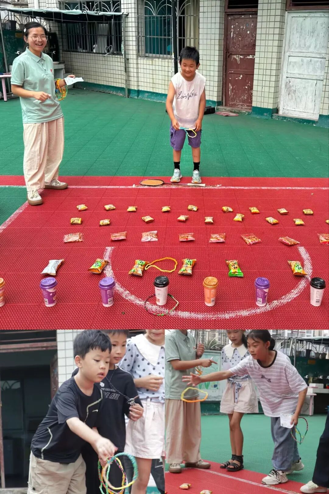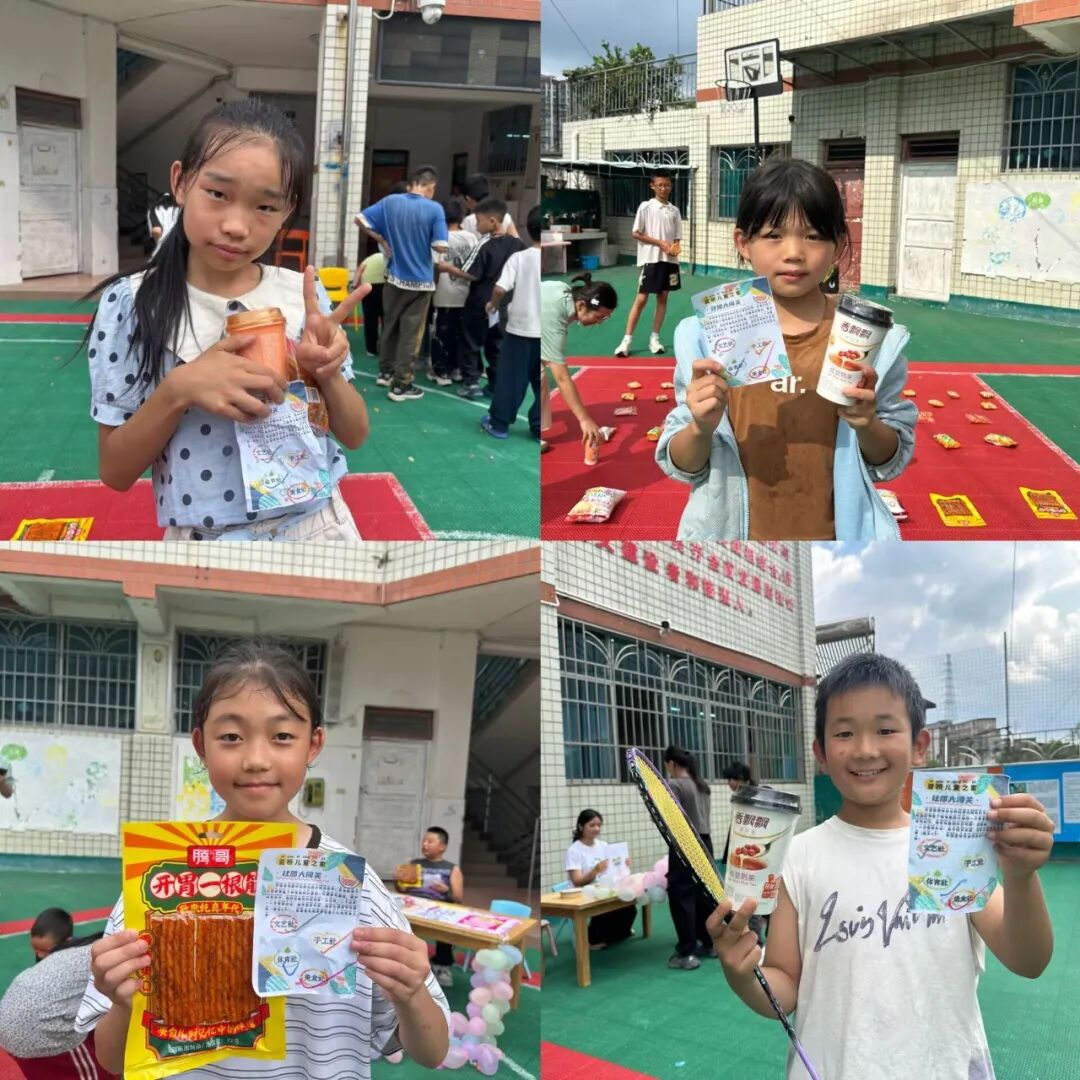 闯关成功后,孩子们用集到的印章兑换套圈机会。套圈区的零食琳琅满目:薯片、辣条、冰棍……小朋友们排队依次尝试。