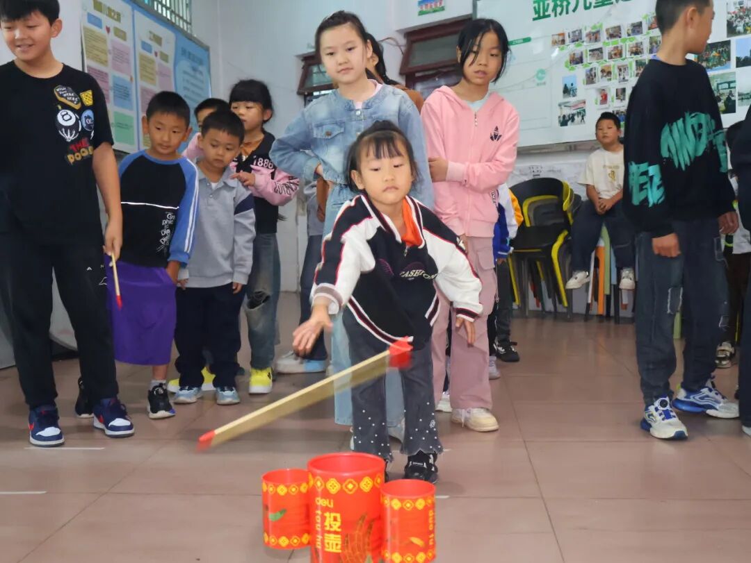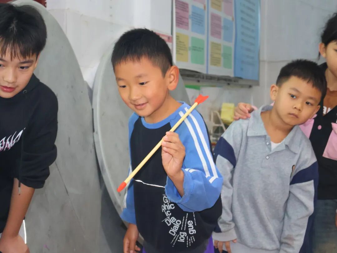 紧接着是传统韵味的 “投壶” 游戏:工作人员在场地中摆好三个投壶,引导小朋友分三队,并按身高设 1 米(1.3 米以下)、1.5 米(1.3 米以上)投掷线确保公平。赛前,工作人员分发 5 支投壶箭,讲解握箭瞄准技巧;