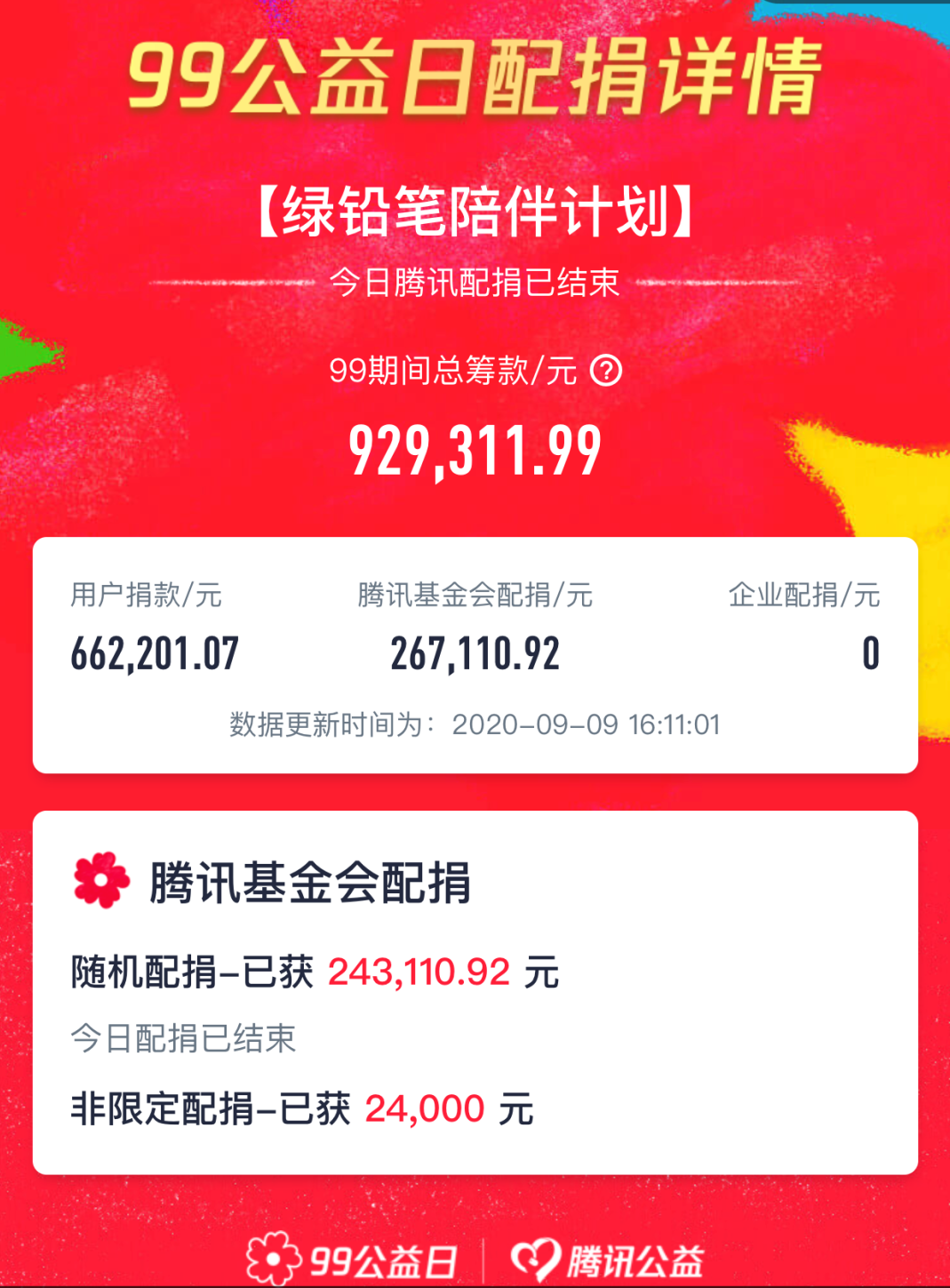 今年的99公益日,很感谢有更多的志愿者加入我们。面对临时调整的规则,大家积极响应,一起调整方案。在大家的共同努力下,我们连同配捐一起筹得善款929311.99元,所有资金均为用于绿铅笔陪伴计划项目。
