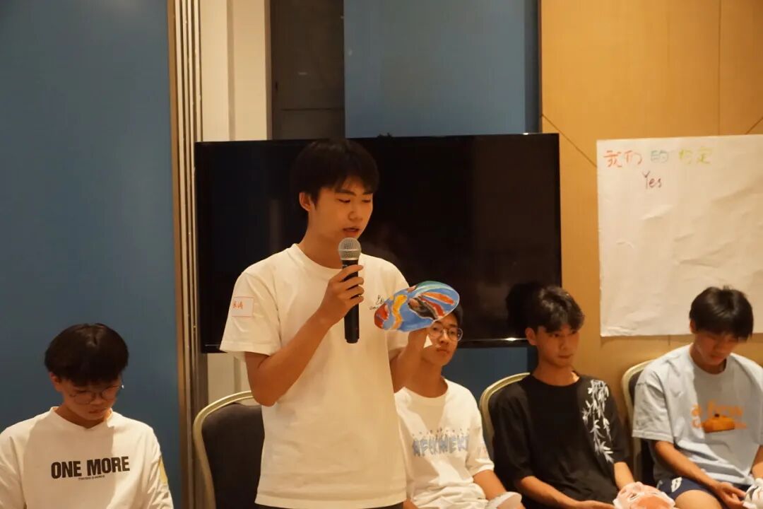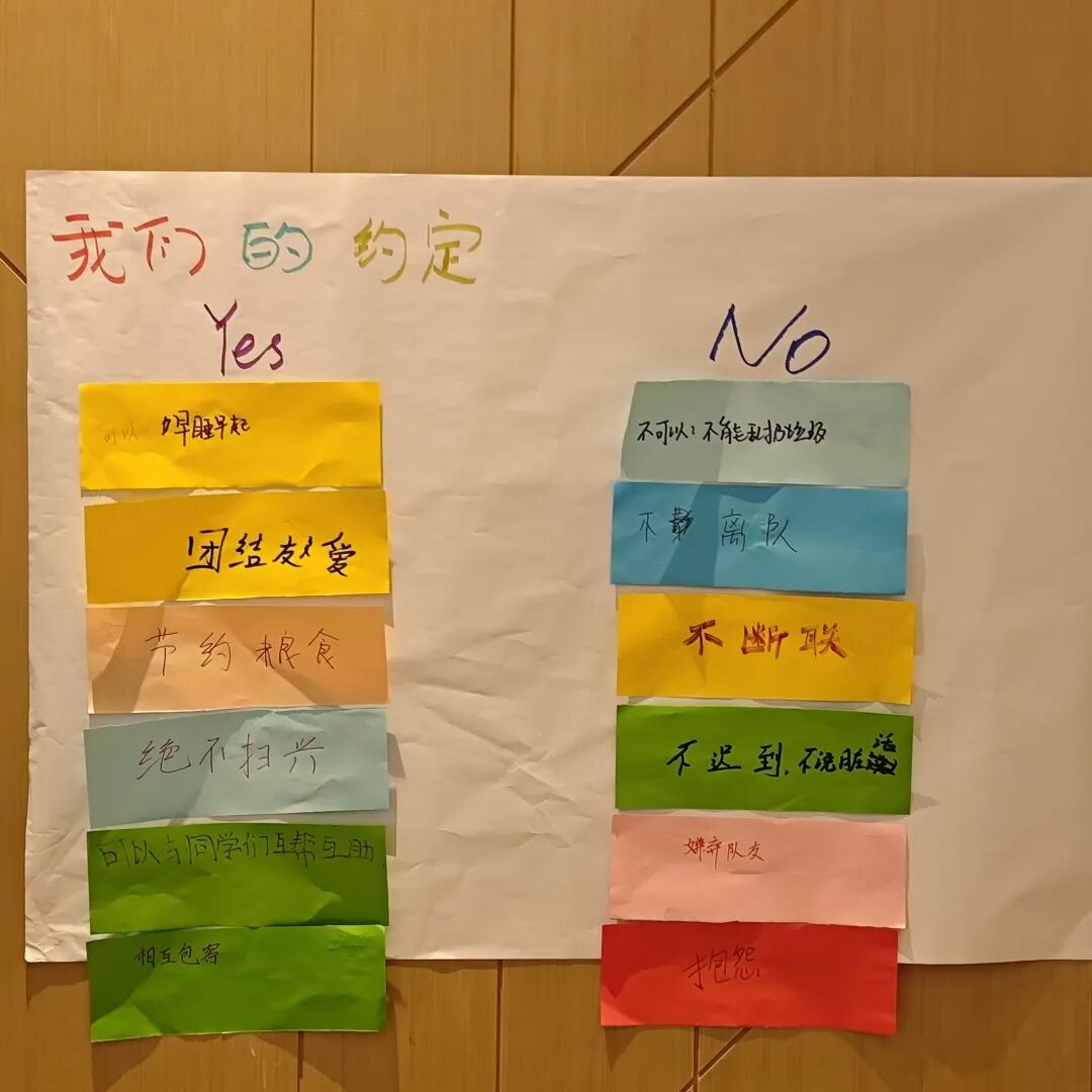 简单的抽纸牌过后,同学们完成了分组,在尴尬与局促中,大家开始确定组长、队名和口号,并共同制定夏令营期间的约定。