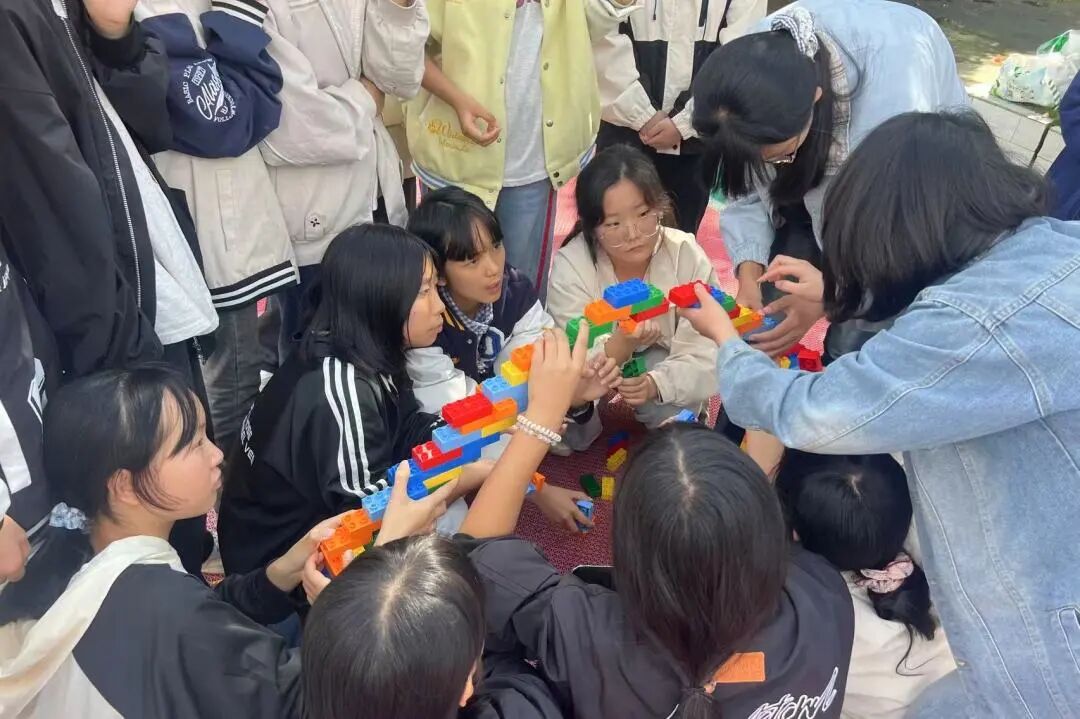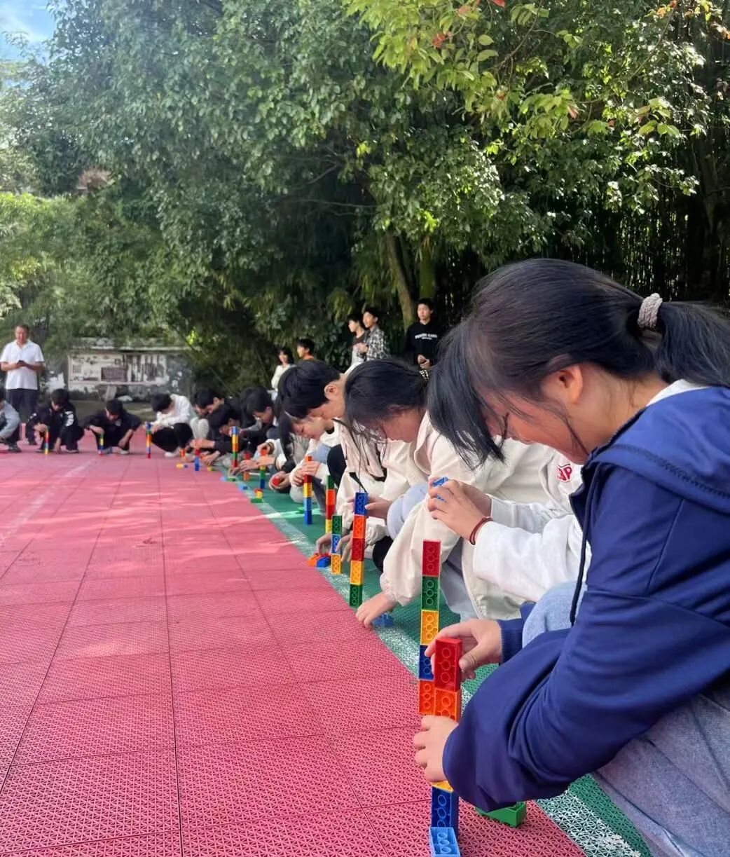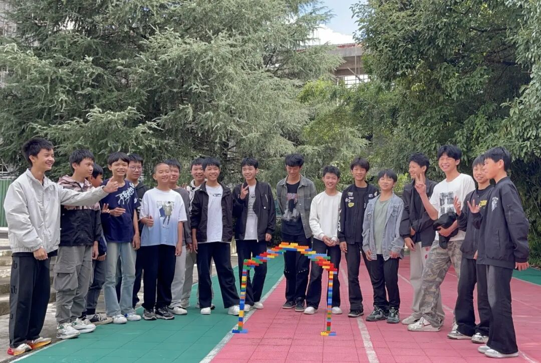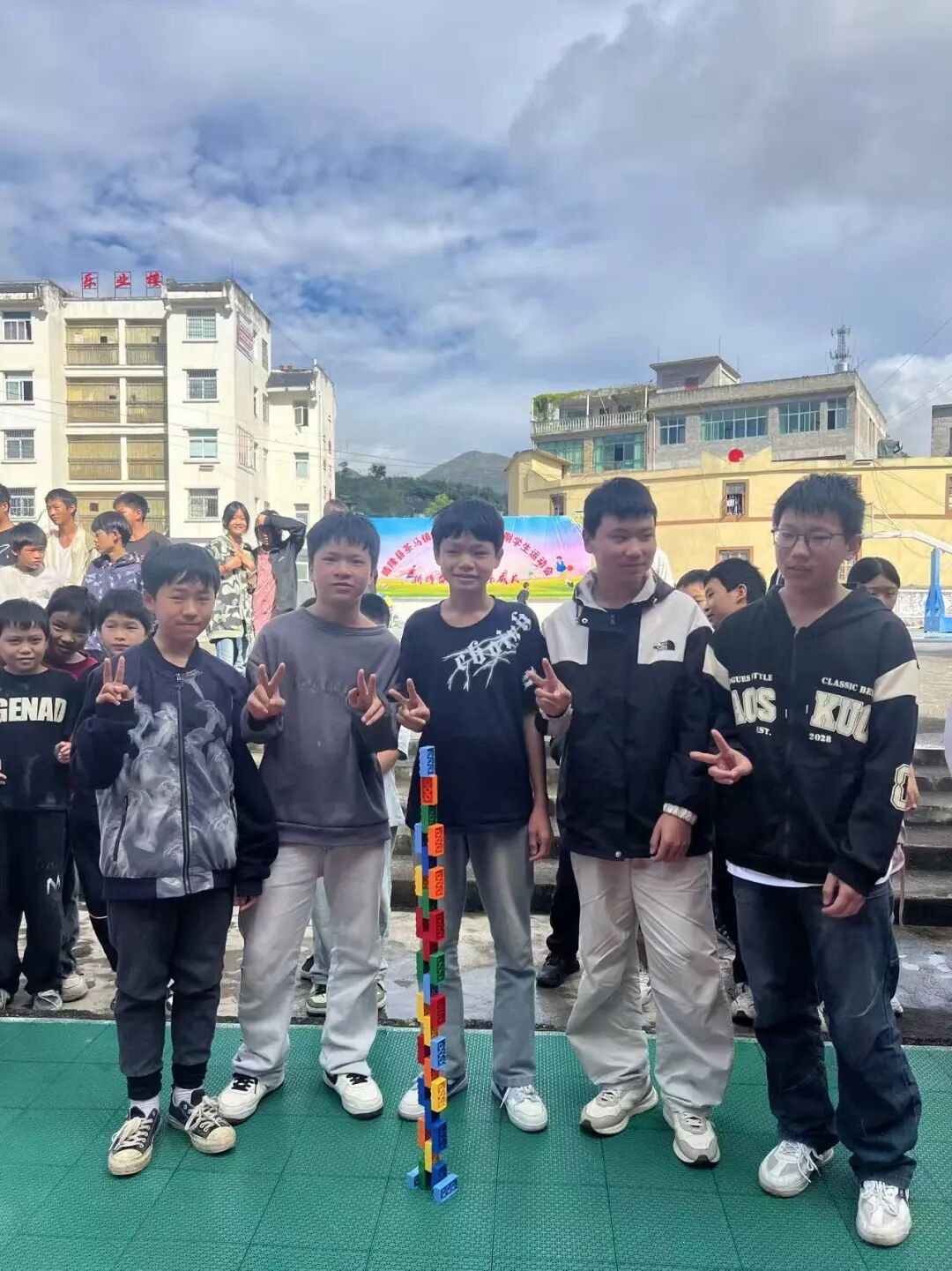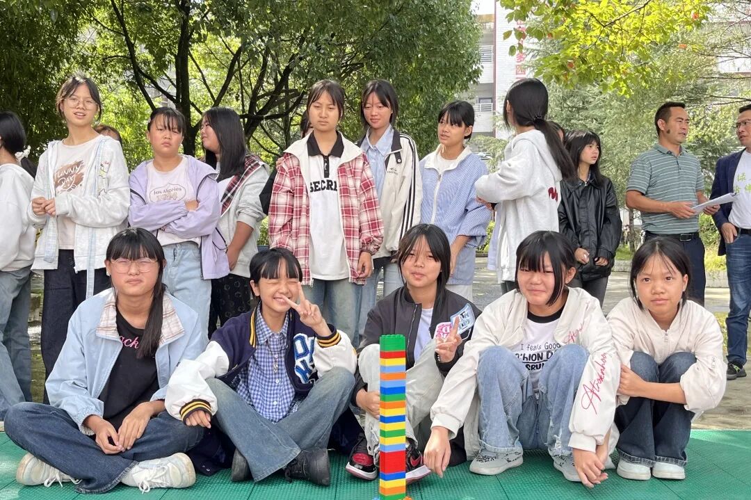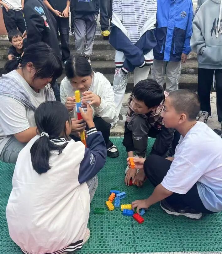 次日,马场中学的 40 名初中生也迎来了这场别开生面的陪伴活动。“个人搭高塔” 锻炼专注与耐心,“双人搭高塔” 培养配合与信任,“团队搭高塔” 凝聚集体的智慧,而 “异形搭高塔” 则不断突破创意的边界。最令人动容的是集体挑战环节,两大组成员齐心协力,用六块简单的积木搭建出象征贵州高度的 “花江大桥”。这座跨越想象的 “桥梁”,不仅展现了同学们的创造力,更搭建起爱心与希望的纽带,让温暖在校园中静静流淌。