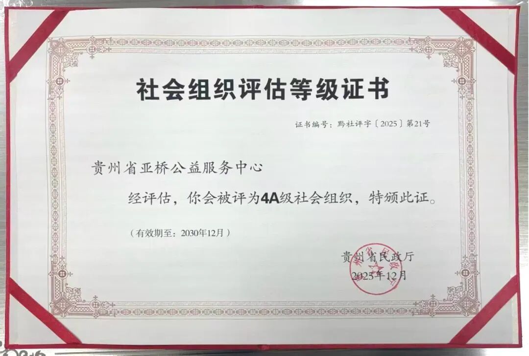 在最新公布的贵州省省级社会组织评估中,贵州省亚桥公益服务中心凭借扎实的工作、规范的管理与广泛的社会影响力,成功获评4A级社会组织!