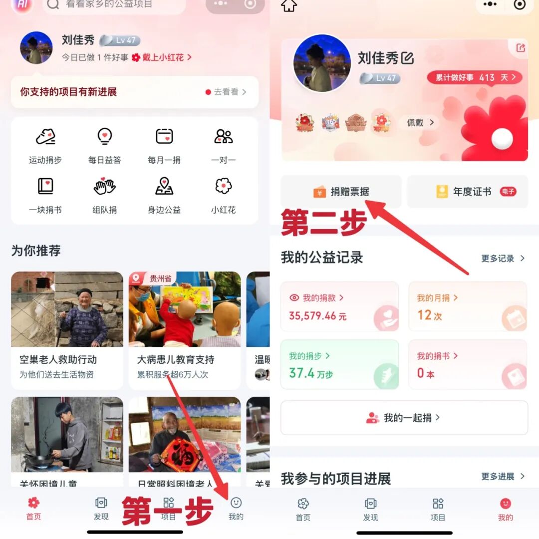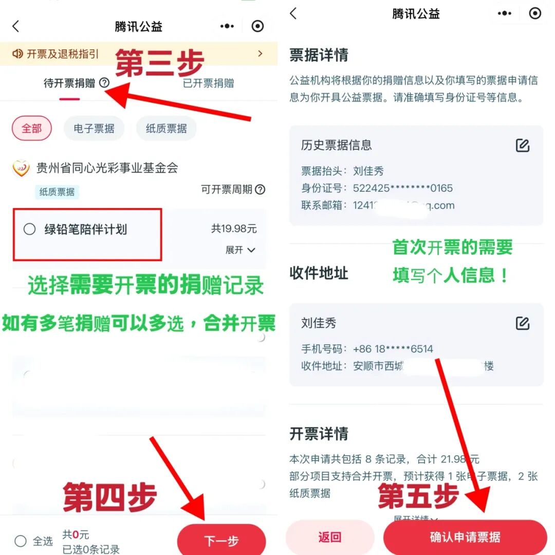 微信搜索【腾讯公益小程序】-点击【我的】-【捐赠票据】-【待开票捐赠】-选择需要开票的【捐赠记录】-点击【下一步】-填写【开票信息(首次开具)】-确认【申请票据】