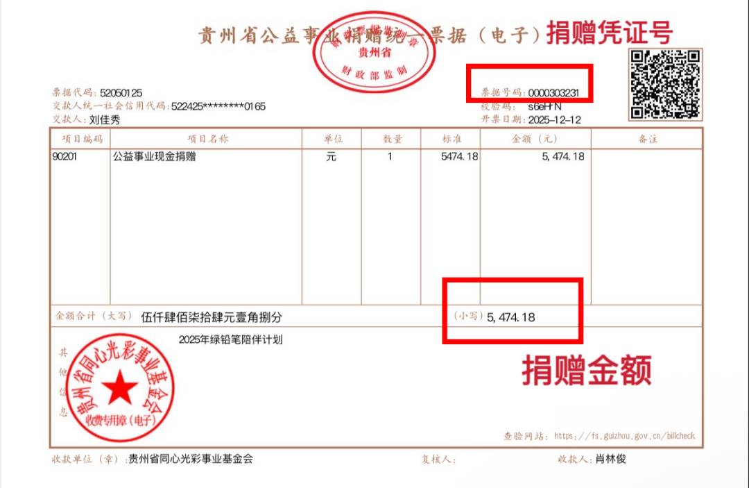 *如果您捐的是【绿铅笔陪伴计划项目】,则输入的公益机构统一社会信用代码为:53520000580666465A受赠单位名称为:贵州省光彩同心事业基金会