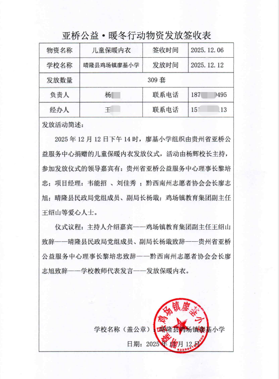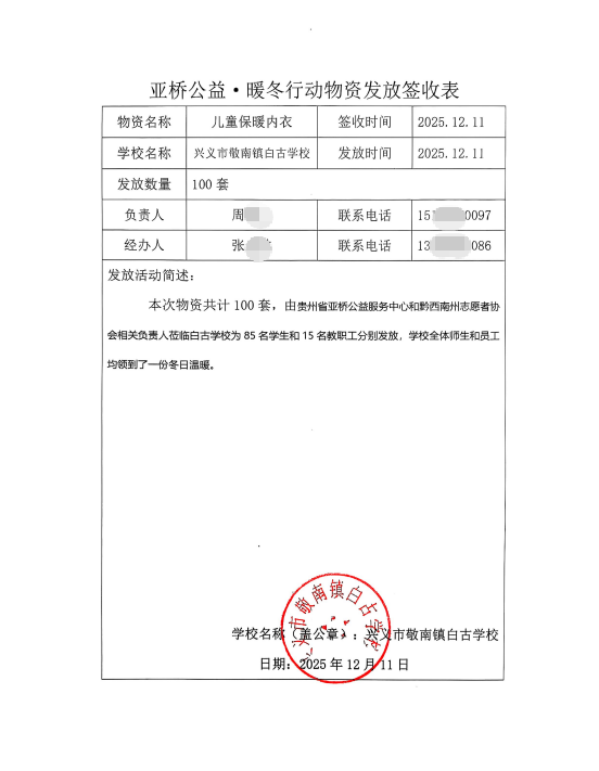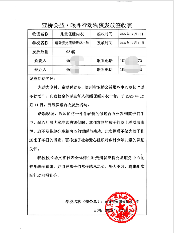 为了让衣物早日送到孩子们手上,亚桥工作人员在收到货的第一时间,马上组织志愿者对物资进行清点、核对。12月5日下午,满载保暖内衣的爱心物资从安顺市发出,驶向兴义市、晴隆县等地的10所乡村学校。每一件衣物,都按照孩子们提供的尺码精心核实,只为合身、更暖心。