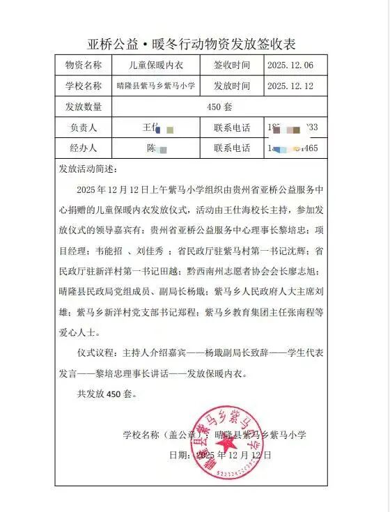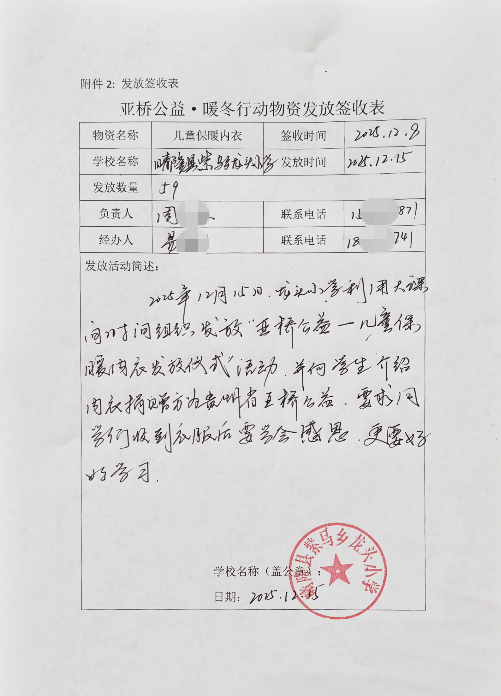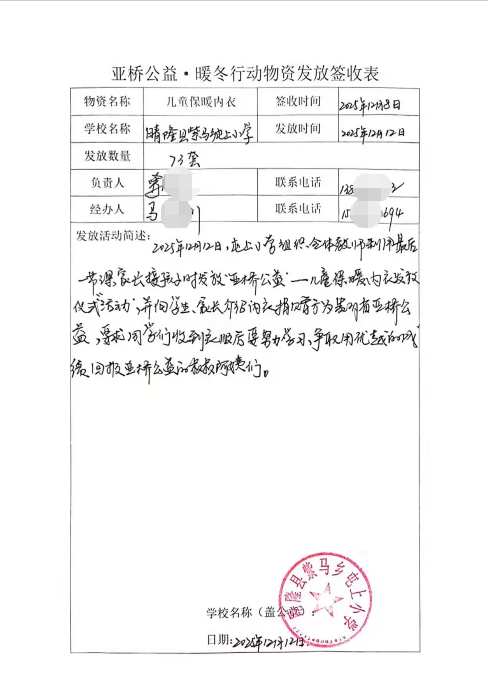 签收表上,一个个学校的公章,一位位负责人的签名,不仅是对物资接收的确认,更是对这份爱心承诺的郑重回应。